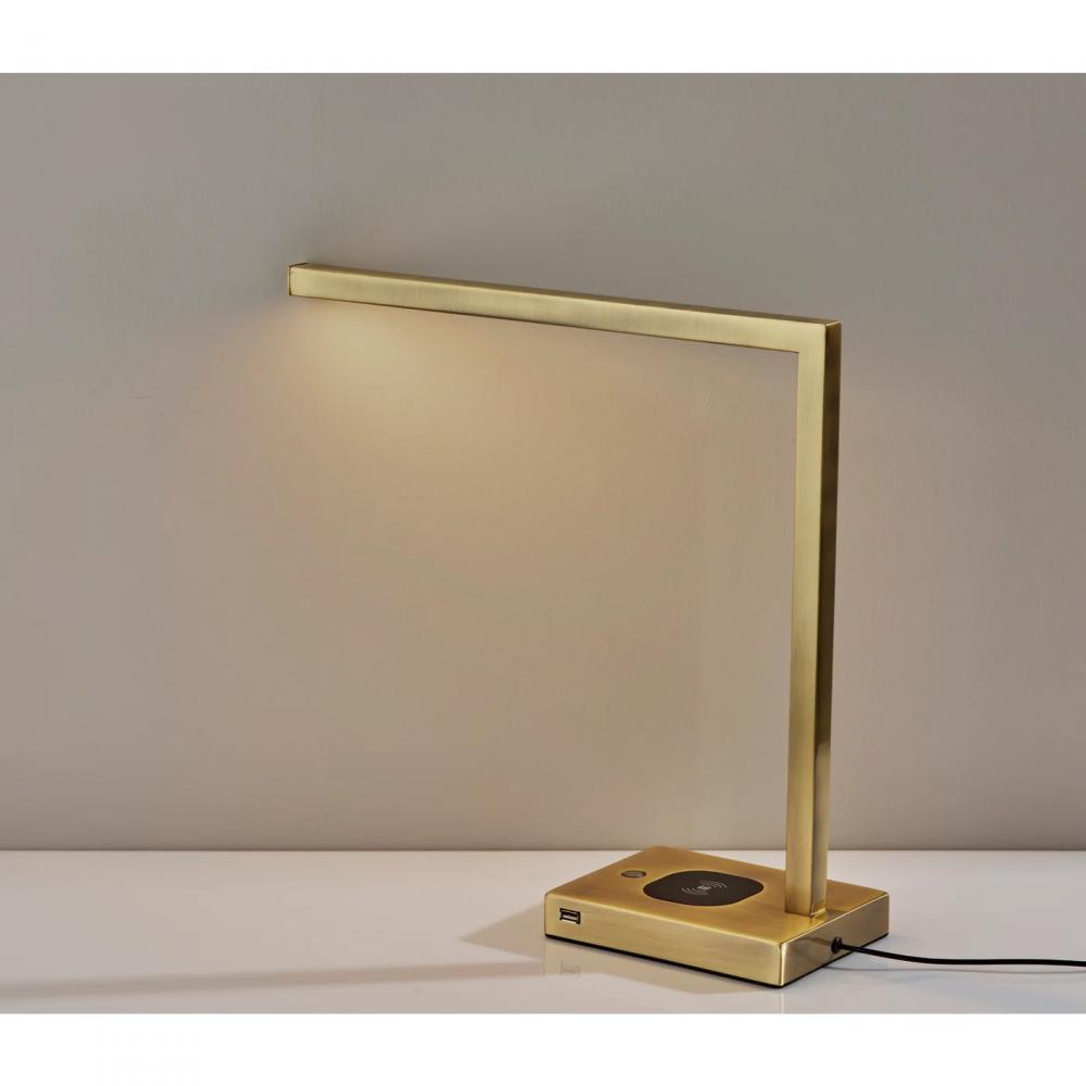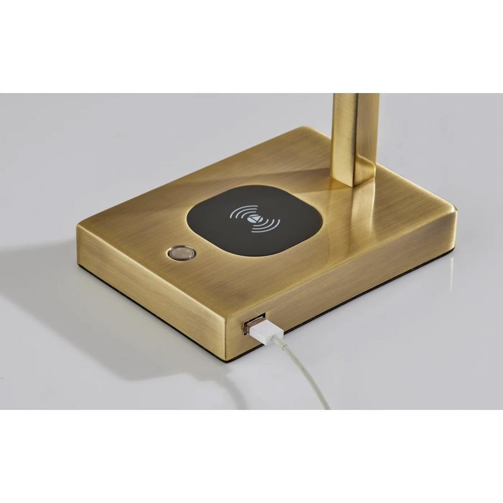 The 16" tall Aidan AdessoCharge LED Wireless Charging desk lamp does double duty, illuminating your space with a modern flair while providing a convenient and stylish charging station for your devices. This compact desk lamp makes a big statement with its clean, rectangular lines and all-over antique brass finish. It also forgoes the traditional lamp shade. Instead, the slim rectangular arm extends 16.5" and contains a discrete, integrated LED bulb with a frosted diffuser to softly disperse the light. At only 6W, this LED produces 400 lumens, making the lamp as energy efficient as it is stylish. The lamp also provides a convenient place to charge your devices. The wireless AdessoCharge pad on the 7" x 5" rectangular base supports 5W of power, which charges your phone from 0% to 100% in just 3-4 hours, depending on your phone model. For those devices that aren't charge pad compatible, the desk lamp also includes a USB port located on the side of the base. The Aidan desk lamp is operated by a 3-step touch switch positioned on the base, making it easy to adjust the lighting to low, medium, high, and off at the touch of a switch, and features a 5' black cord.