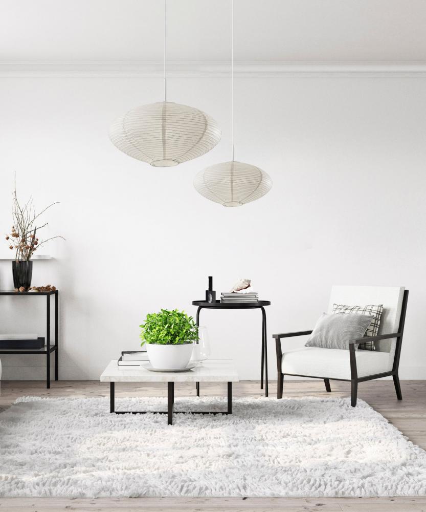 The Alana pendant light adds a modern spin to the traditional paper lantern design. With a monochrome look, the pendant features a round white canopy base supporting an off-white paper shade measuring 11" tall and 20" in diameter. The shade softly distills the light from a 60W bulb for an even, warm glow. Hang the pendant by itself or pair it with several more to create a stunning effect and add illumination to your kitchen, dining area, bedroom, or bathroom. With a 5? white cord, the height of the light can be adjusted to suit the needs of any room regardless of the ceiling height. The Alana pendant light is also available in a larger, 13.25" tall and 24" diameter option.