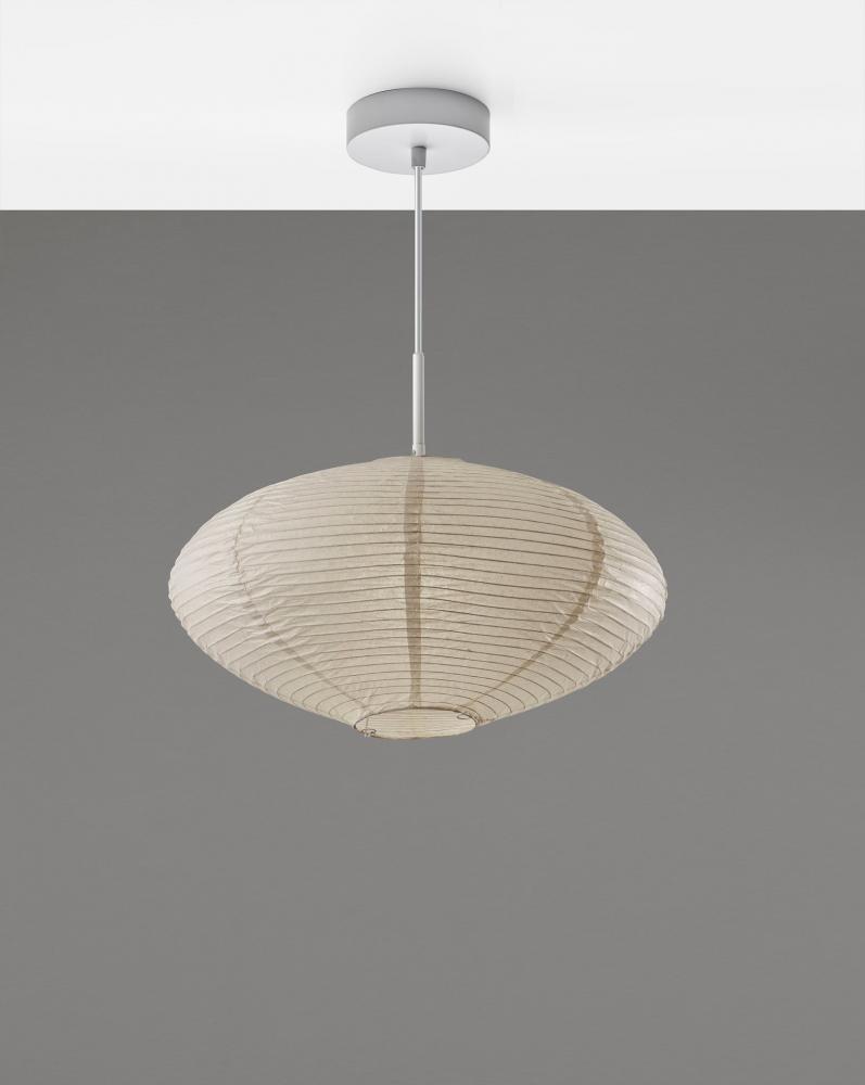 The paper shade's silhouette offers a modern interpretation of traditional designs.