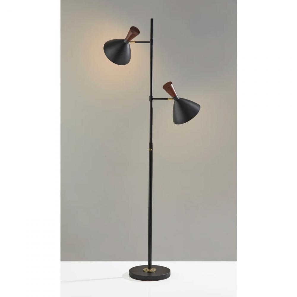 Add a touch of modern to your living space with the Arlo Tree Lamp. The Arlo Collection channels mid-century modern styling with an accentuated oversized shade silhouette. With two shades, this floor lamp offers both directive and ambient lighting. Walnut wood accents create a warm contrast to a matte black finish. Adjust the shades to direct light where it is needed. Bulbs are not included.