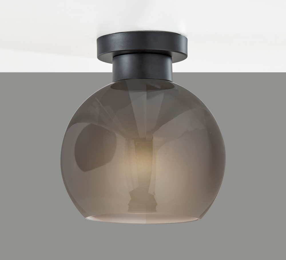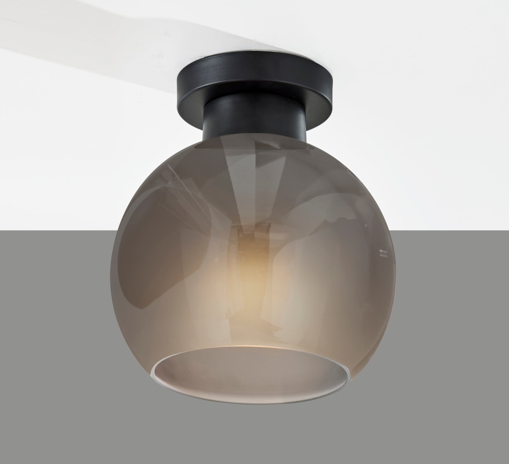 Introducing the 3895-01 Atticus Flush Mount, a sleek and contemporary lighting fixture designed to enhance your home's decor. With its black finish and 9-inch diameter globe-shaped smoked glass shade, this flush mount adds a touch of modern sophistication to any room. The glossy exterior of the shade contrasts beautifully with the frosted interior, creating a unique and captivating lighting effect. Hardwire compatible for seamless installation, the Atticus Flush Mount is the perfect choice for adding style and ambiance to your space.