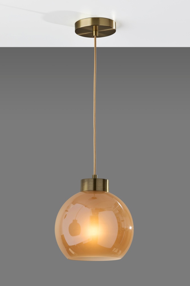 Introducing the 3896-21 Atticus Pendant, a timeless lighting fixture that combines vintage charm with modern sophistication. Featuring an antique brass finish and a 9-inch diameter globe-shaped amber glass shade, this pendant light exudes warmth and elegance. The glossy exterior of the shade contrasts beautifully with the frosted interior, creating a captivating lighting effect that enhances any interior decor. Complete with a beige fabric-covered cord and hardwire compatibility, the Atticus Pendant offers versatile installation options and effortless integration into your space.
