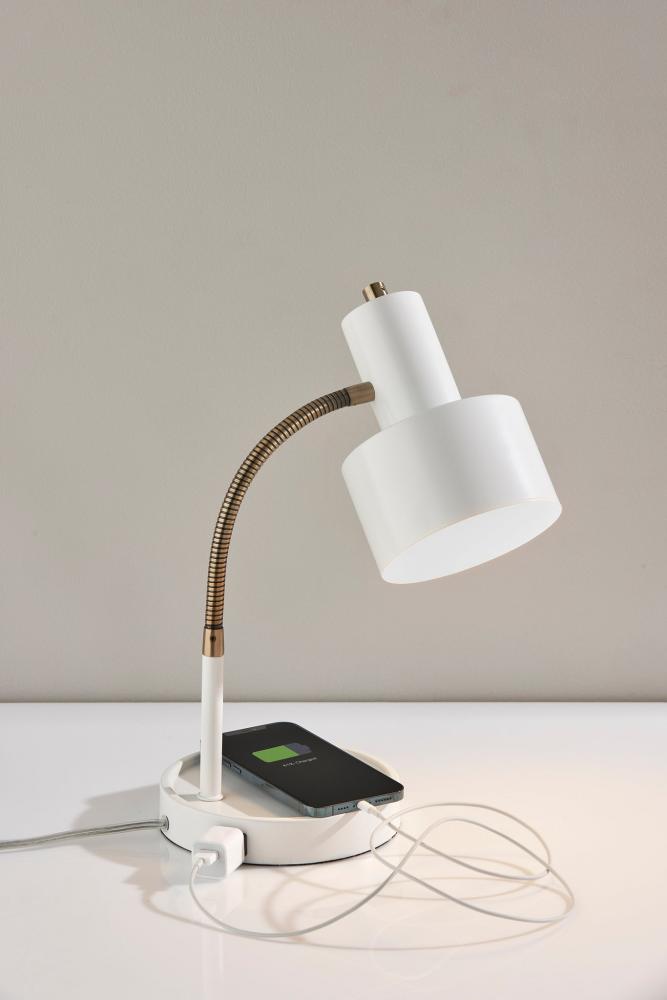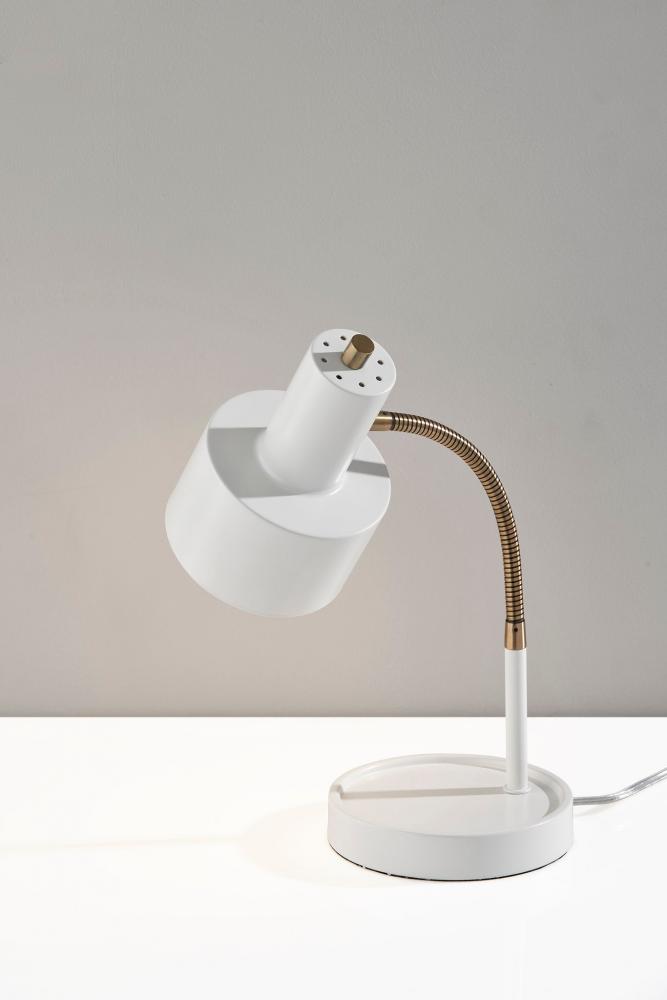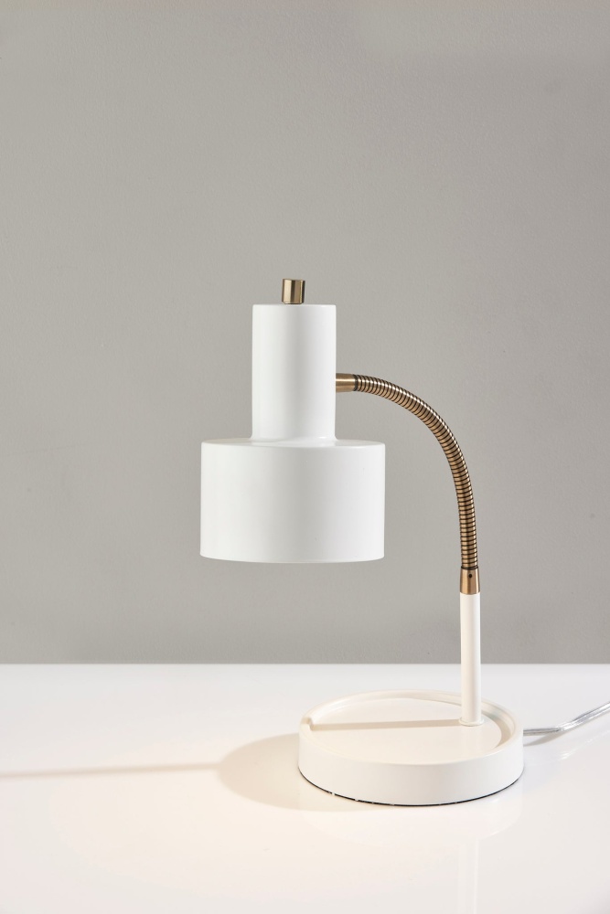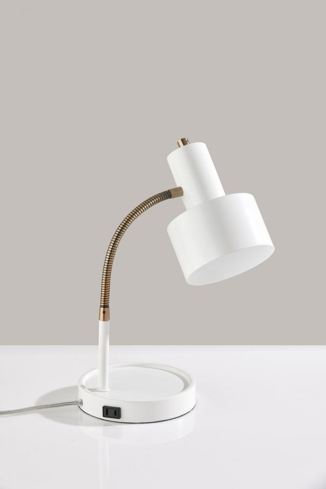 Meet the SL3971-02 Baker Desk Lamp, where modern design meets functionality. This lamp features a striking combination of white and brass finishes, making it an elegant addition to any workspace or living area. The white metal shade adds a touch of sophistication and directs focused illumination right where you need it. The adjustable gooseneck arm allows you to position the light exactly as you desire, making it ideal for reading, working, or studying. But this desk lamp doesn't stop at illumination; it includes a built-in AC outlet on the base, providing you with a convenient charging spot for your devices. The on/off rotary switch on the shade ensures easy operation. Elevate your desk or workspace with the Baker Desk Lamp's sleek aesthetics and practical features.