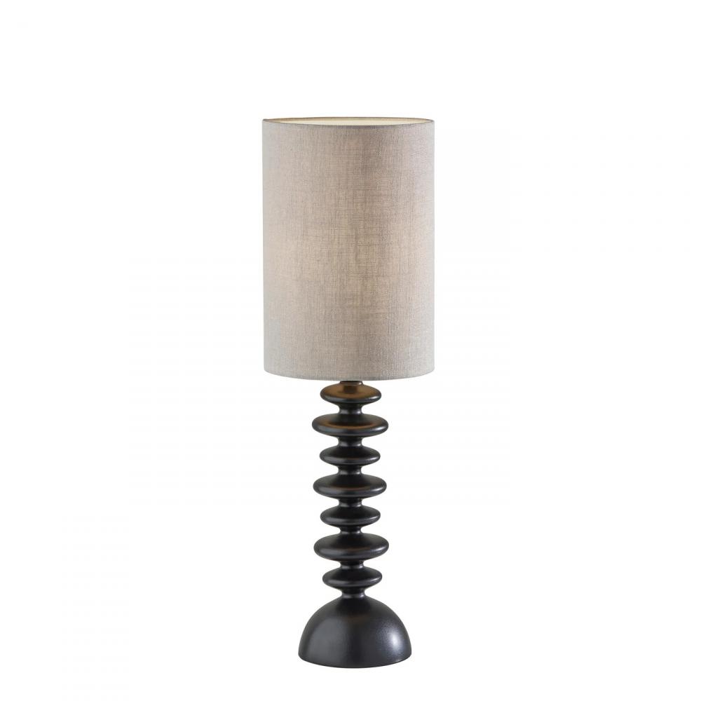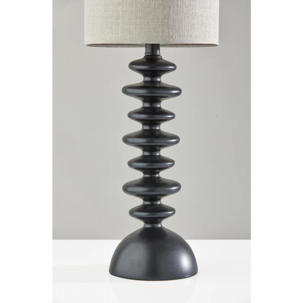 Bring elegant, contemporary style to your space with the unique silhouette of the Beatrice table lamp. At 28.5" tall, this lamp is the perfect addition to nightstands or accent tables. It features a 6" dome-shaped base to ensure stability. The black matte finish continues up the distinctive stem, which includes seven round designs of varying sizes. The lamp is topped by a tall 13" tall and 9" diameter taupe textured fabric drum shade to softly diffuse light from a 100W bulb (not included). Operated by a rotary socket switch to easily turn the lamp on or off, it is also powered by a 5' black cord. Complete your decor with the shorter Beatrice table lamp measuring 22.5" tall and the Beatrice floor lamp.
