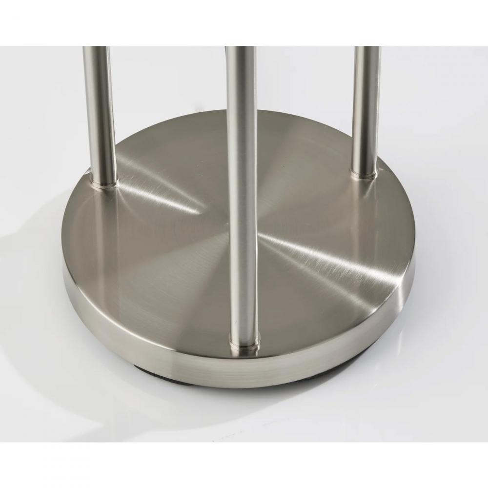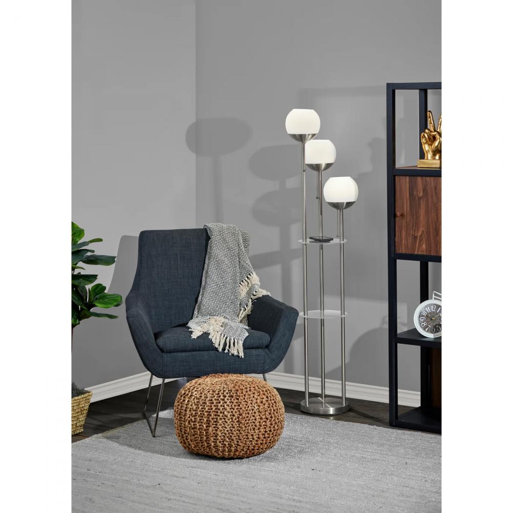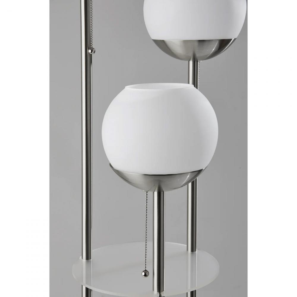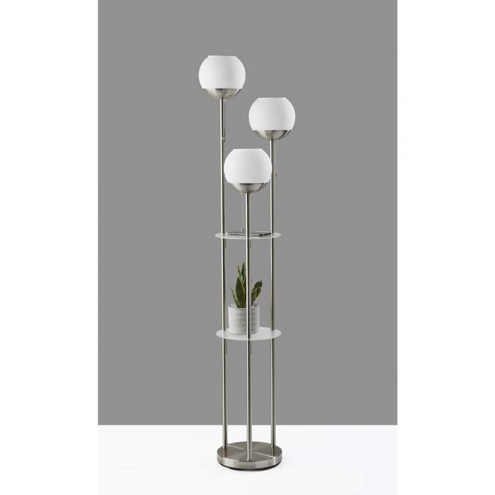 Bring a blend of style and function to your space with the 63" Bianca floor lamp. Featuring two 10" round frosted acrylic shelves, this lamp provides storage and display opportunities. The bottom shelf has a clearance of 34.75", making it a perfect place to display vases, picture frames, or other taller items, while the 20" clearance for the top shelf makes it ideal for placing drink glasses, phones, or other smaller pieces. The 10" metal base with a brushed steel finish makes for a sturdy design, while the three brushed steel poles arranged in a triangular pattern rise cleanly to three lighting heads of varying heights for an eye-catching design. The three 7" globe shades are made of white opal glass that complement the shelving and can be operated separately with pull chains, allowing you to control the amount of lighting. Each of the three globe shades ensconce 40W bulbs (not included), while the lamp also features a 5' clear cord. The Bianca floor lamp is also available with an antique brass finish.