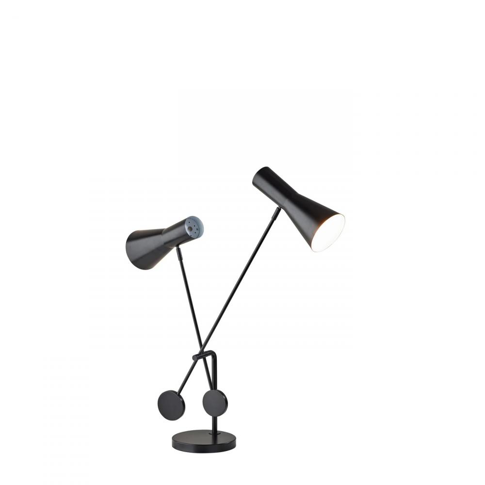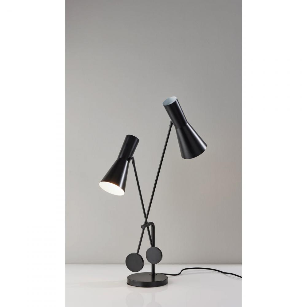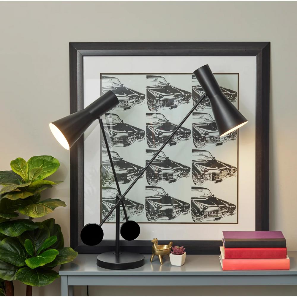 The Bond desk lamp by ADS360 is an artistic and functional statement piece to complete your modern industrial décor. Featuring two black cone metal shades affixed to two stems with round decorative ends, the lamp has a matching black metal stem and base. For maximum lighting and aesthetic versatility, both the direction of the shades and the angle of the stems can be adjusted to suit the spacing and lighting needs of any space. Based on the selected positioning, the desk lamp has a maximum height of 33.5" and a maximum width of 36" inches. The lamp's base also features a discreet USB port to conveniently charge your phone or other devices. Operated by touch switches located on the shades, the Bond desk lamp powers two 40W Type A bulbs (not included) and features a 5' black fabric-covered cord. Complete your interior design with the matching Bond floor lamp.