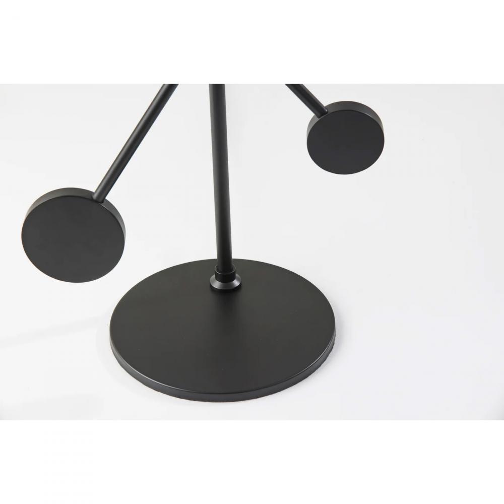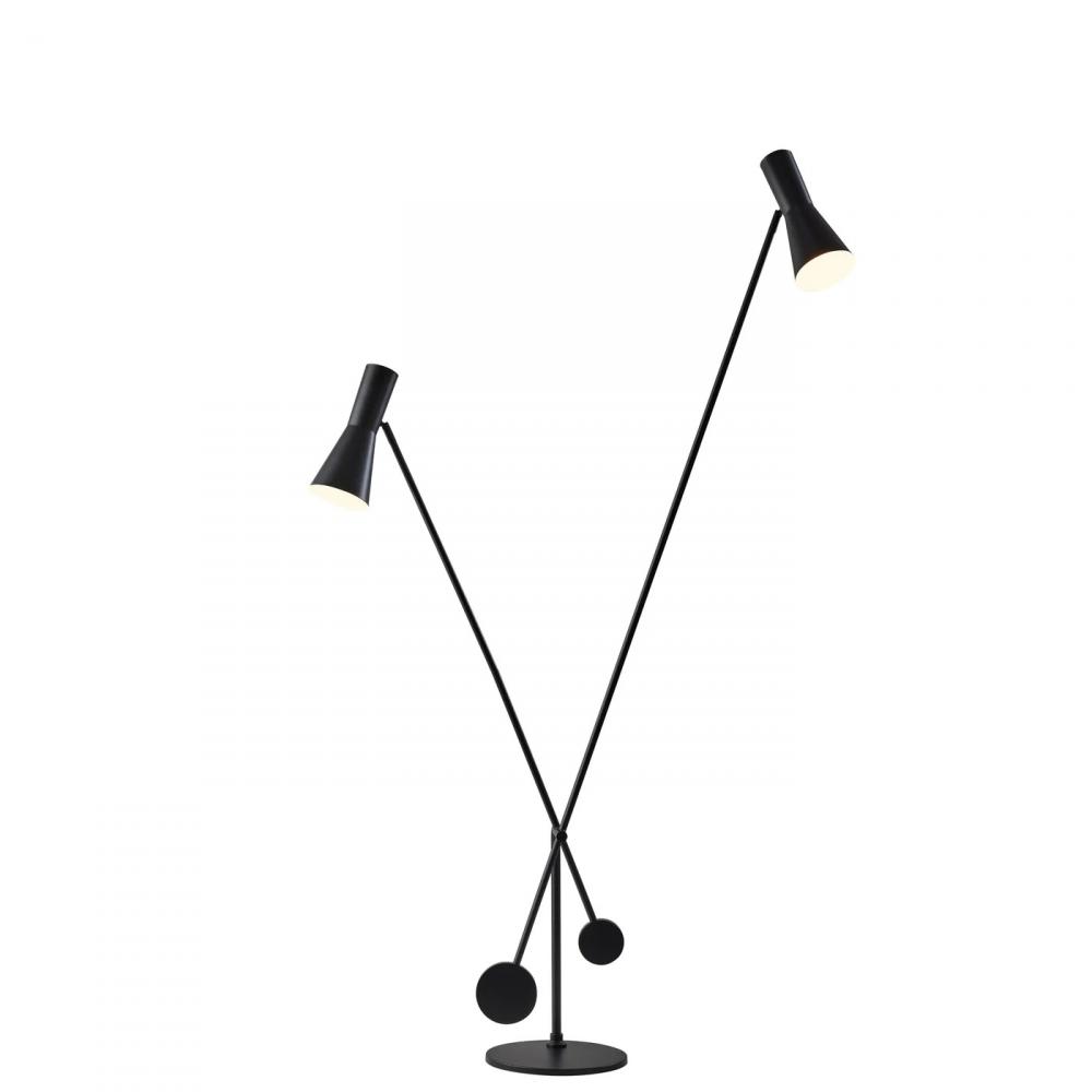 The Bond floor lamp by ADS360 is an artistic and functional statement piece to complete your modern industrial décor. Featuring two black cone metal shades affixed to two stems with round decorative ends, the lamp has a matching black metal stem and base. For maximum lighting and aesthetic versatility, both the direction of the shades and the angle of the stems can be adjusted to suit the spacing and lighting needs of any space. Based on the selected positioning, the floor lamp has a maximum height of 72.5" and a maximum width of 55" inches. Operated by touch switches located on the shades, the Bond floor lamp powers two 40W Type A bulbs (not included) and features a 5' black fabric-covered cord. Complete your interior design with the matching Bond desk lamp.