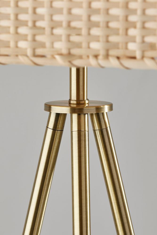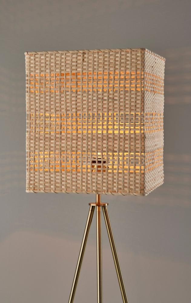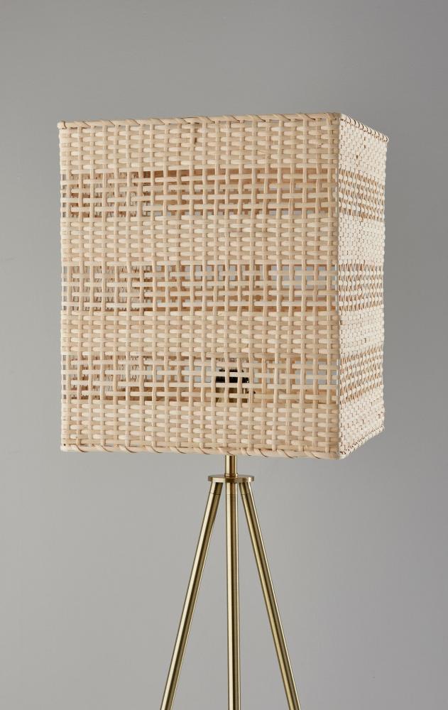 The strong coastal design elements and contemporary silhouette of the Bondi floor lamp bring effortless style to living rooms, offices, bedrooms, and more. The clean lines of three legs with an antique brass finish form a tripod design for a 21.75" footprint. This base supports a large rectangular light rattan shade with heavy texturing for a stunning look that gently disperses the light from a 100W bulb. For versatile lighting options, a 3-way rotary socket switch easily adjusts the brightness between low, medium, high, and off. Complete your decor with the coordinating Bondi table lamp and pendant light.