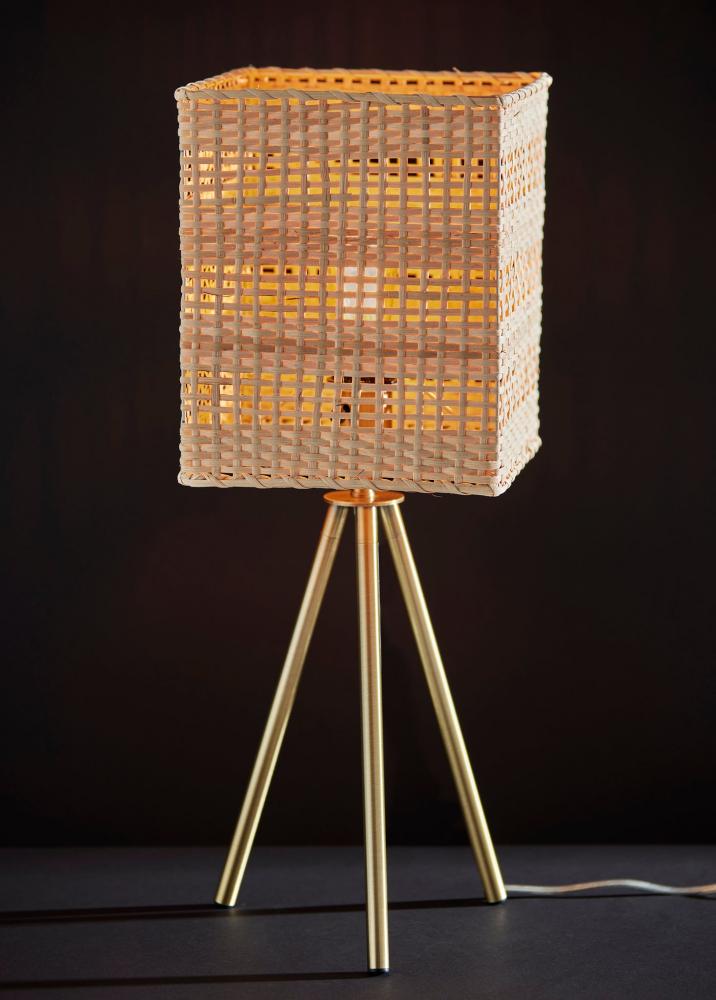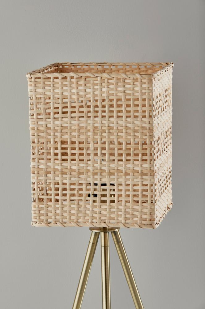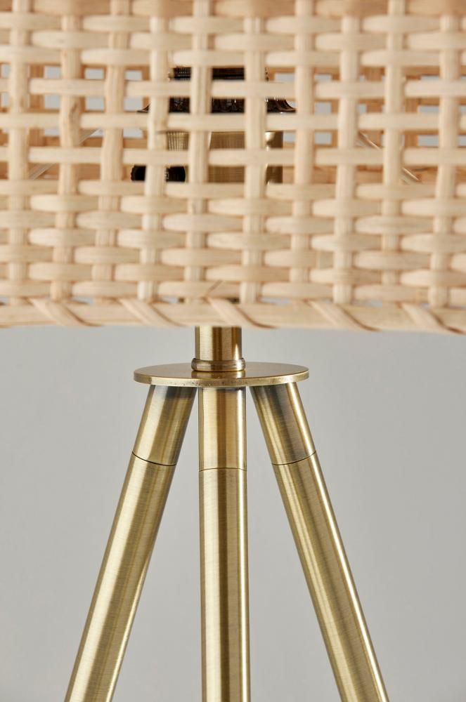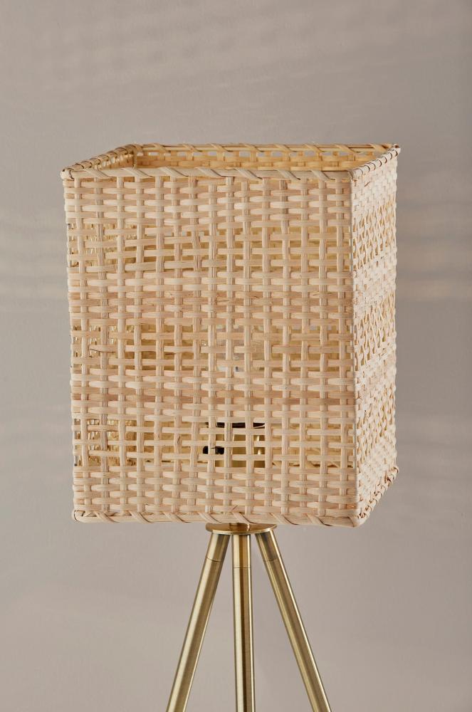 The strong coastal design elements and contemporary silhouette of the Bondi table lamp bring effortless style to living rooms, offices, bedrooms, and more. The clean lines of three legs with an antique brass finish form a tripod design for a 9" footprint. This base supports a large rectangular light rattan shade with heavy texturing for a stunning look that gently disperses the light from a 60W bulb. The lamp is easily turned on and off with a rotary socket switch. Complete your decor with the coordinating Bondi floor lamp and pendant light.