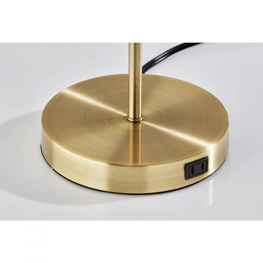 The 18" tall Bowie table lamp shines a light on vintage-inspired design in a mix of antique brass and black finishes. With its geometric symmetry and art deco flair, it is the perfect statement piece for desks, side tables, or nightstands. It features a sleek metal dome shade in black finish that curves like a canopy over the lamp's slender pedestal and round base, both featuring an antique brass finish. For convenient access to power right from your desk or table, the 6.5" diameter base features an AC outlet. Whether the lamp is turned on or off, the AC outlet will keep working normally. Operated by dual pull chains in antique brass finish to easily turn it on or off, the lamp powers two 40W bulbs (not included) and features a 5' clear cord. The Bowie table lamp is also available with a white, pale blue, or pale pink finish on the shade.