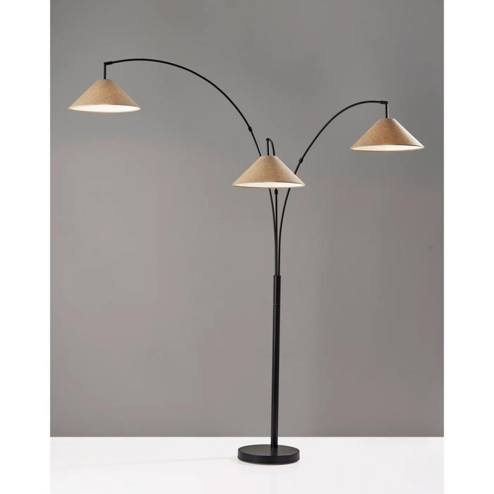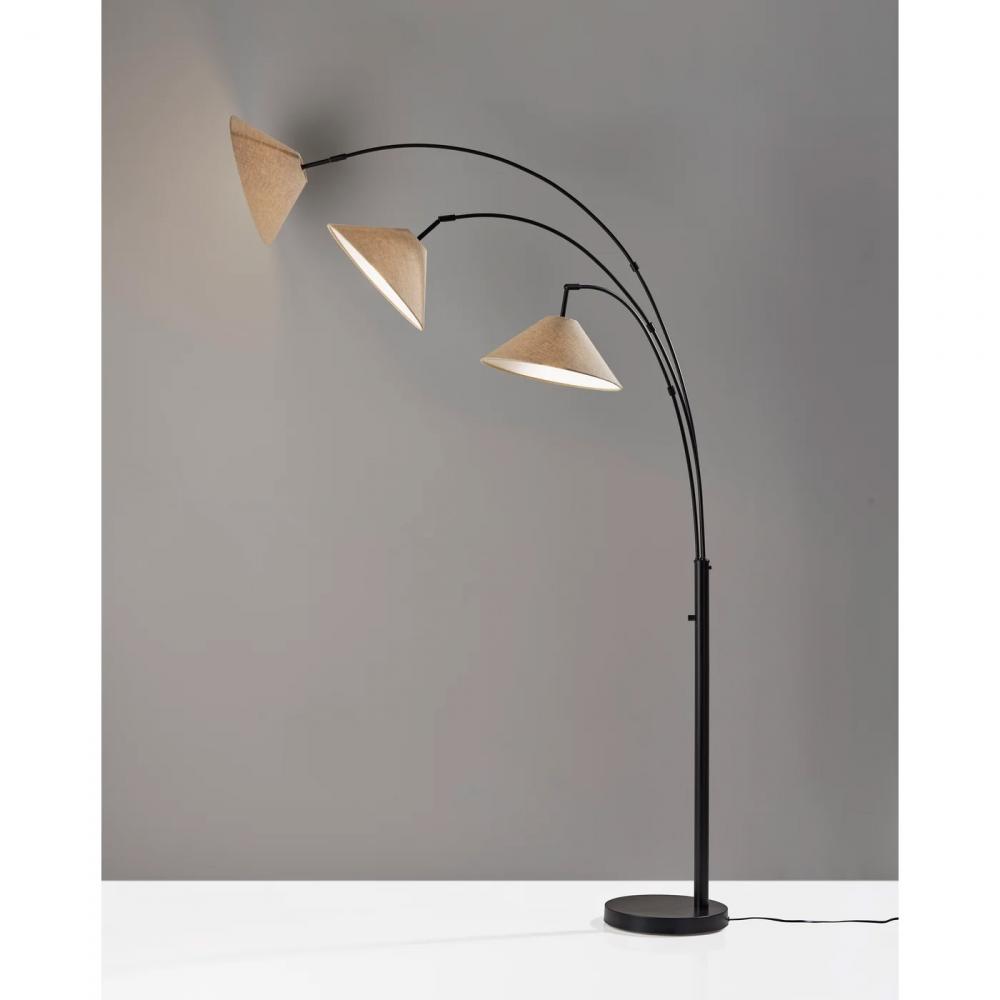 Add a modern touch to your space with the clean styling of the Braxton 3-Arm Arc floor lamp. The arcing design and slender profile of this 86" tall lamp makes it the perfect light source for any space. The 12.5" diameter round brushed steel base provides stability, while the clean lines in dark bronze add a modern, minimalist touch. The dark bronze finish continues through the pole and arcing arms. For maximum versatility, the lamp features three arms, each topped with a 60W bulb (not included) and textured light brown fabric shade that features a contemporary cone shape. The three arms can be swiveled and repositioned from the base and each head features an adjustable joint, allowing you to direct the light wherever it's needed. Operated by a rotary switch located on the stem, this lamp features multiple lighting settings so you always have the desired amount of light. A simple twist of the switch turns one lightbulb on, another twist turns two of the lightbulbs on, a third twist illuminates all three of the lights, and a fourth twist turns all lights off. The Braxton 3-Arm Arc floor lamp is also available with a brushed steel finish and coordinating white textured fabric shade.