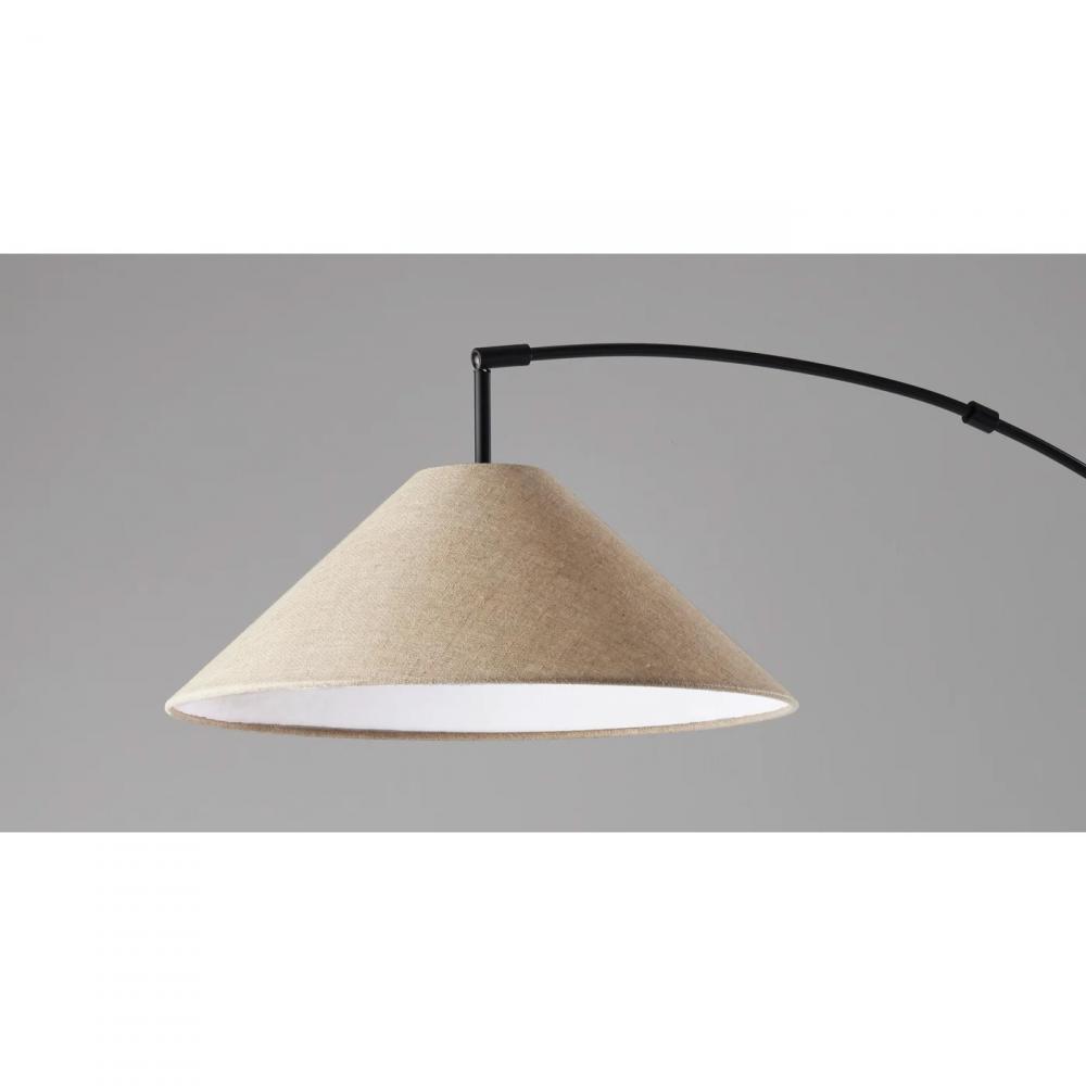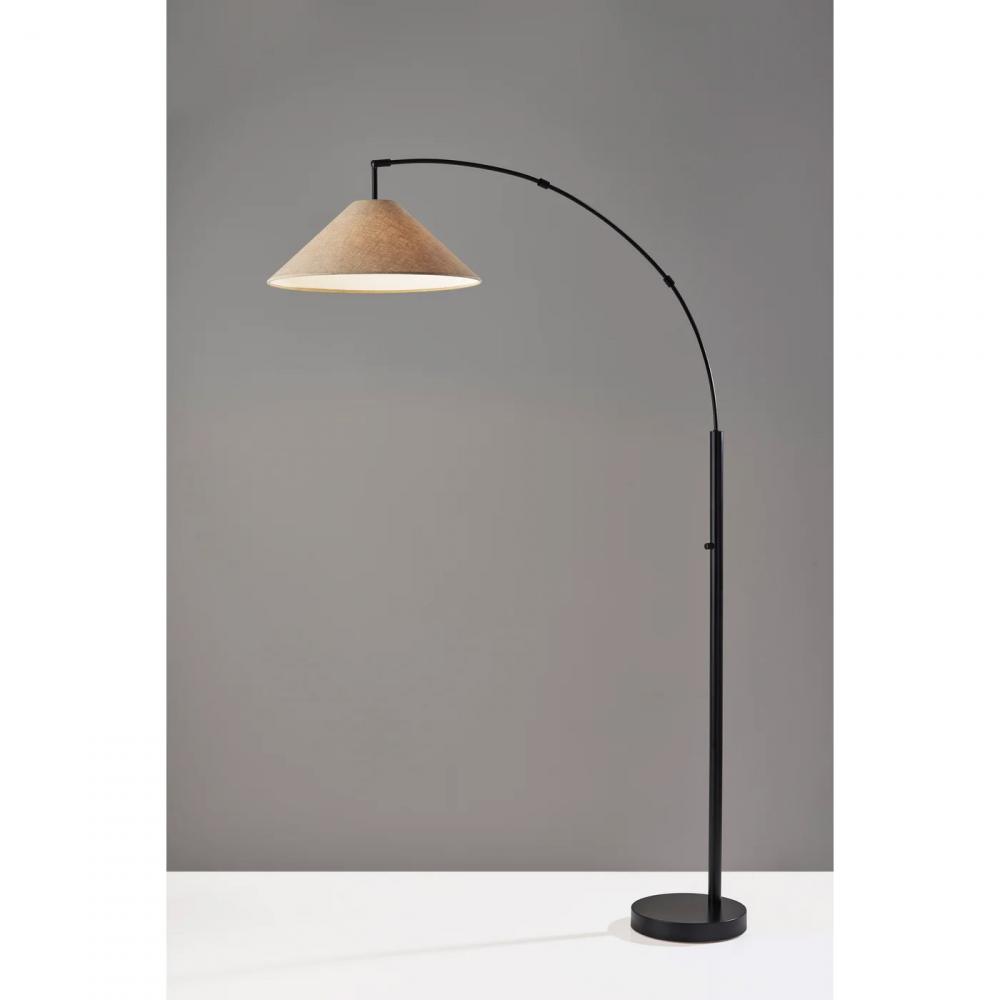 Add a modern touch to your space with the clean styling of the Braxton Arc floor lamp. The arcing design of this 76" tall lamp makes it the perfect light source for reading in a recliner or working at a desk, while its slender design makes it easy to position near love seats, couches, armchairs, or side tables. For even greater versatility, the lamp's head features an adjustable joint, allowing you to direct the 100W bulb (not included) wherever it's needed. The 11" diameter round dark bronze base provides stability, while the clean lines in dark bronze add a modern, minimalist touch. The dark bronze finish continues through the pole and arcing stem. Topping off the lamp is a shade made of textured light brown fabric that features a contemporary cone shape. Operated by a rotary switch located on the stem to easily turn it on or off, the lamp also includes a 5' black cord. The Braxton Arc floor lamp is also available with a brushed steel finish and coordinating white textured fabric shade.