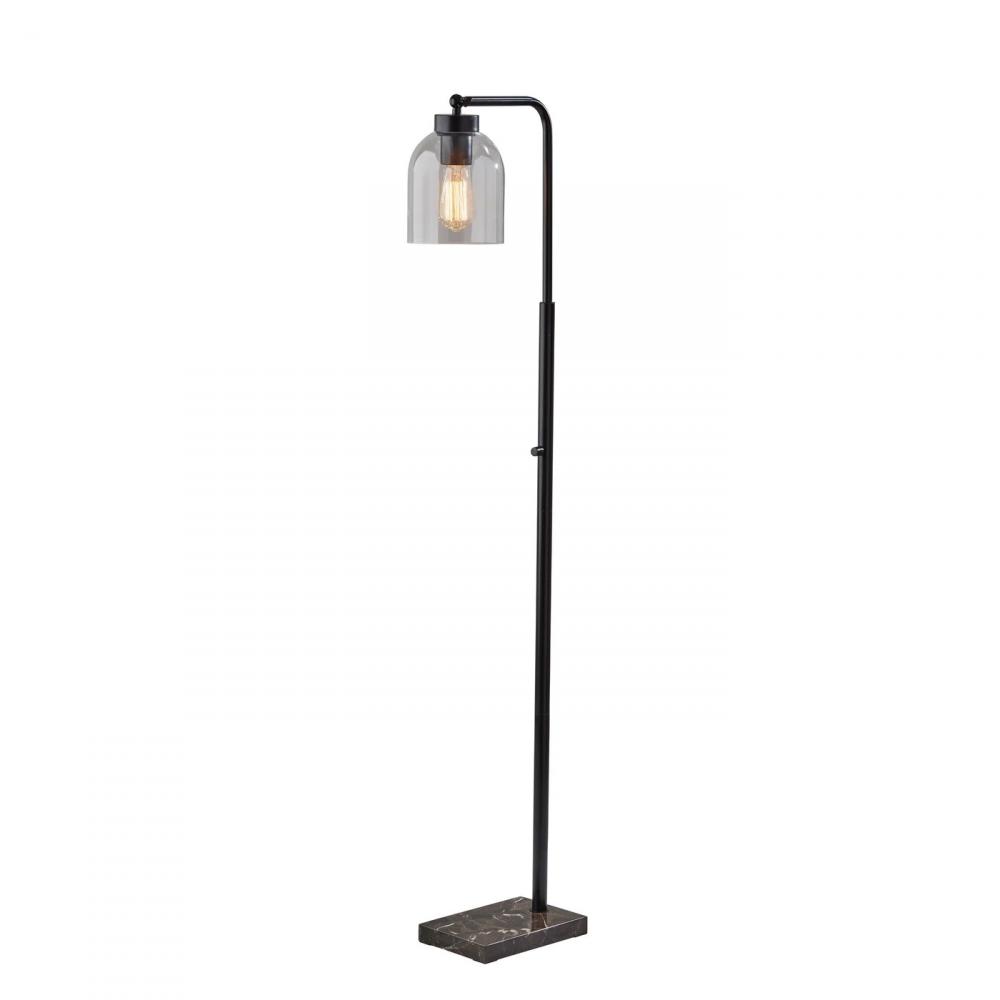 Brighten your space with the mid-century modern styling of the 55" tall Bristol floor lamp. The 9.5" x 6.4" rectangular brown marble base is both stylish and sturdy, while the slender stem and socket feature a black metal finish. To spotlight the included decorative 40W vintage Edison bulb, the dome-shaped shade is crafted of clear glass. This lamp also features an articulation point at the base of the shade, allowing you to direct the light wherever it's needed. Operated by a rotary switch in black metal finish located on the stem, the lamp also includes a 5' black cord. The Bristol floor lamp is also available with an antique brass finish.