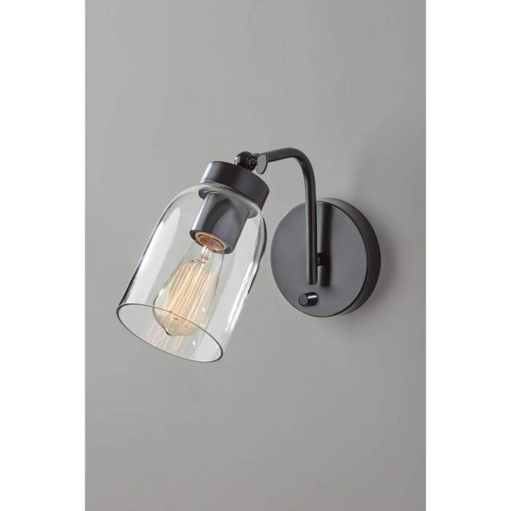 Brighten any wall with the mid-century modern styling of the Bristol wall lamp, crafted of clear glass with a black metal base, arm, and socket. The dome-shaped shade is made of clear glass, exposing the included decorative 40W vintage Edison bulb. This lamp also features an articulation point at the base of the shade, allowing you to direct the light wherever it's needed, and is operated by a rotary switch located on the 5" diameter round base. This lamp is also compatible with wall dimmer switches. Pair two of these vintage-inspired sconces on either side of beds, fireplaces, or mirrors for décor-enhancing symmetry, or place individually in entryways or other spaces for a pop of light. The Bristol wall lamp is also available with an antique brass finish.