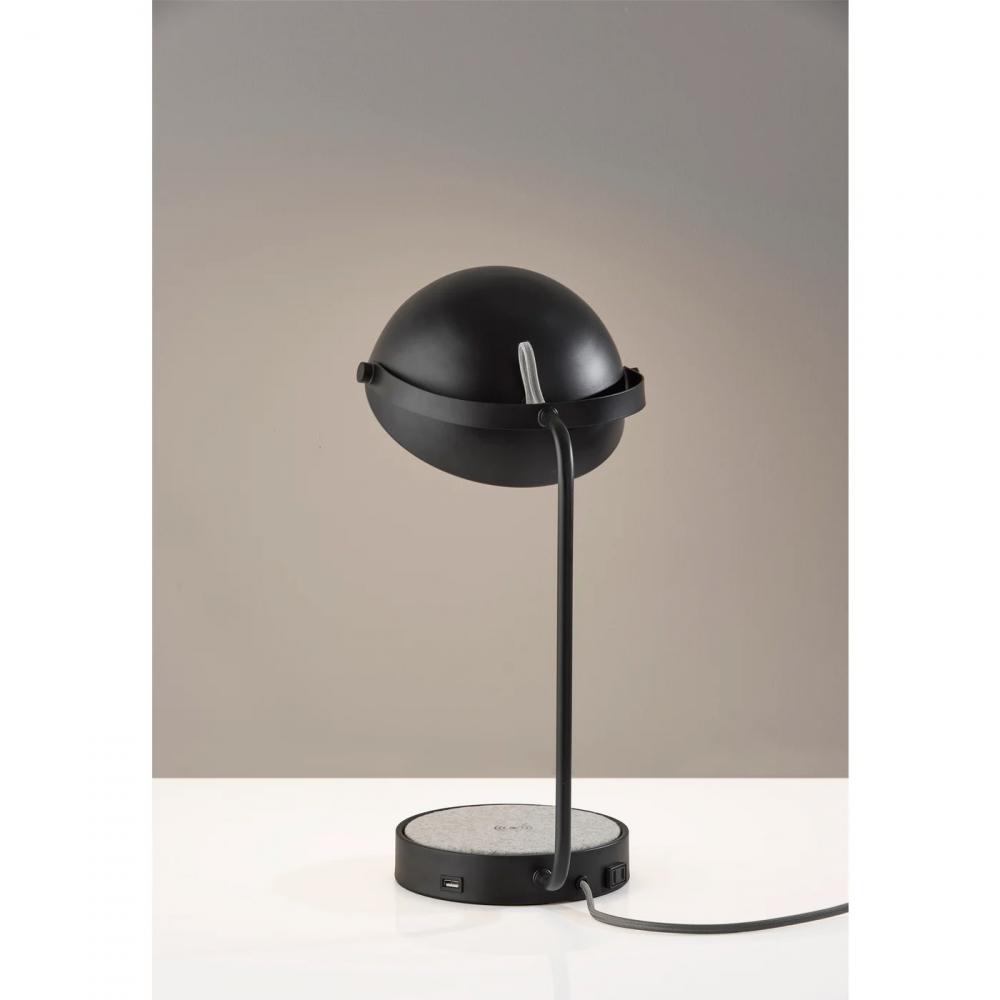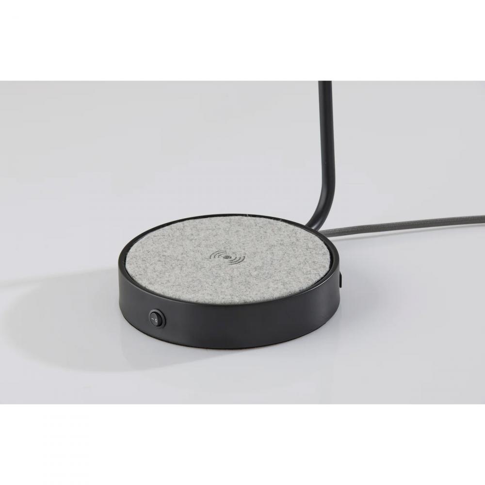 Form meets function with this stylish wireless charging desk lamp. The understated grey fabric wireless charging pad is built into the base and features Qi inductive charging technology. Just place your compatible smart device on the pad for simple, cord-free charging and easy access to your phone. The AdessoCharge pad supports 5W charging on contact with the charging pad, which charges your phone from 0% to 100% in just 3-4 hours, depending on your phone model. In addition to this cutting edge technology, the base also includes a USB port as well as an AC outlet in order to charge multiple devices at once. With an 8" diameter metal dome-shaped shade and clean styling with black finish, the 18" tall Brooks AdessoCharge desk lamp is the ideal lighting and charging addition to your work space or bedroom. Turn this lamp on or off easily using the discreet switch located on the base. It is also powered by a 5' long cord covered in subdued grey fabric.