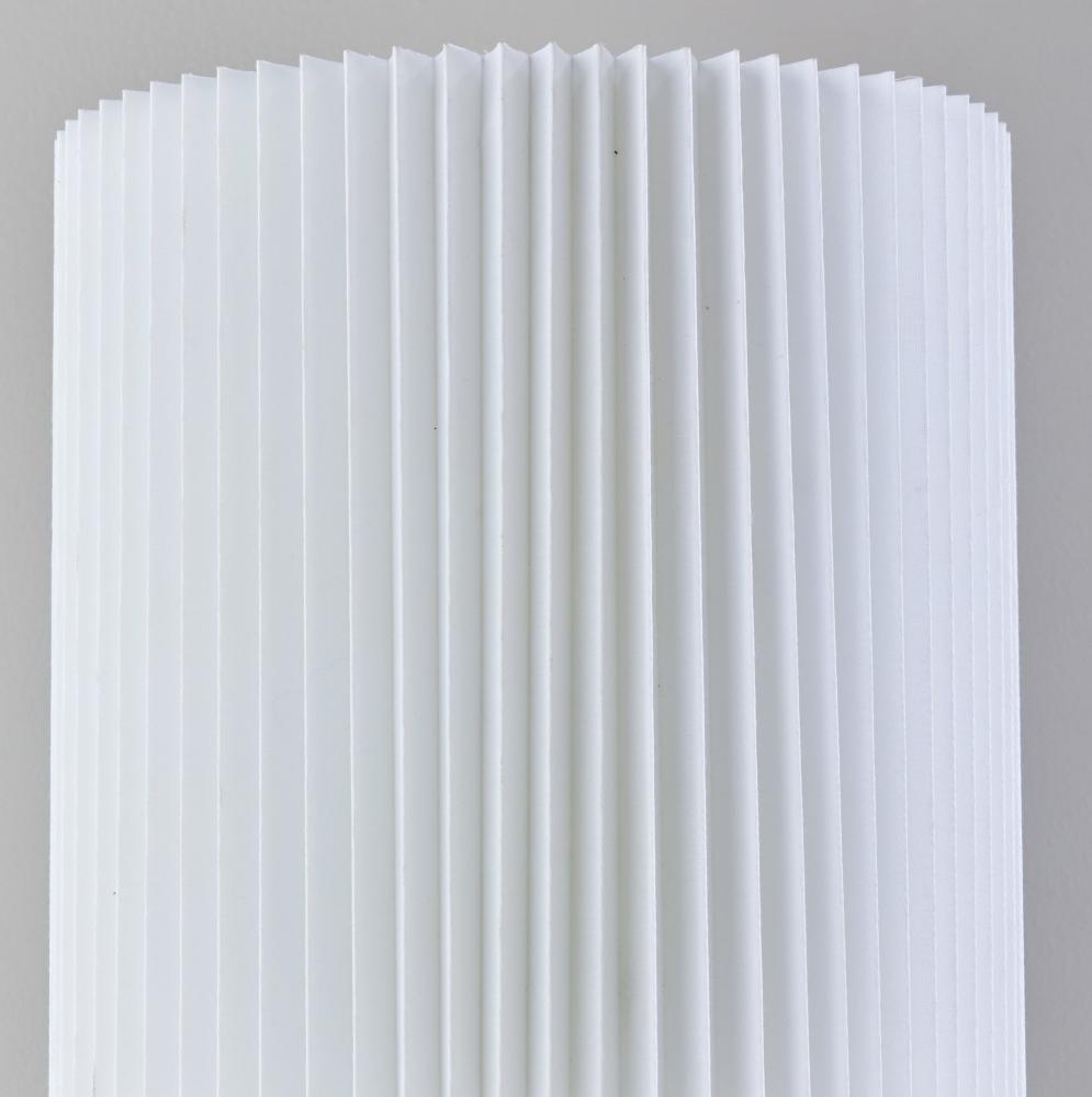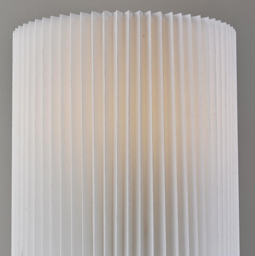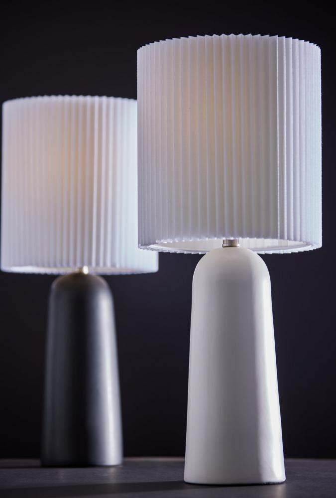 Less is more! With a casual and elegant design, the 26" tall Callie table lamp complements elegant, Scandinavian decor. The 6" diameter dome base features clean lines and white ceramic construction while the white pleated fabric drum shade adds an elegant design touch. Operated by a rotary socket switch to easily turn the 100W bulb on or off, the table lamp is also powered by a 5' clear cord. For a variety of style options, the Callie table lamp is also available with a black or beige ceramic base.