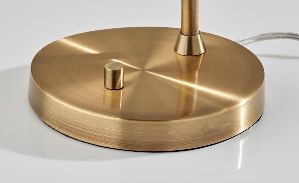 With a blend of contemporary and mid-century modern design elements, the Camden desk lamp imbues any space with warmth and light. A round base with an antique brass finish supports a matching gently arcing stem. Suspended from the stem is a 6.5" diameter globe shade crafted of smoked glass with a delicate swirl pattern. The glass leaves the 40W bulb visible, making a vintage Edison bulb (not included) a striking choice. For added versatility, the base of the lamp shade features an articulation point, allowing you to redirect the shade for a variety of looks and lighting options. Complete your decor with the coordinating Camden flush mount ceiling light, pendant light, wall lamp, floor lamp, and arc lamp.