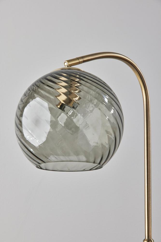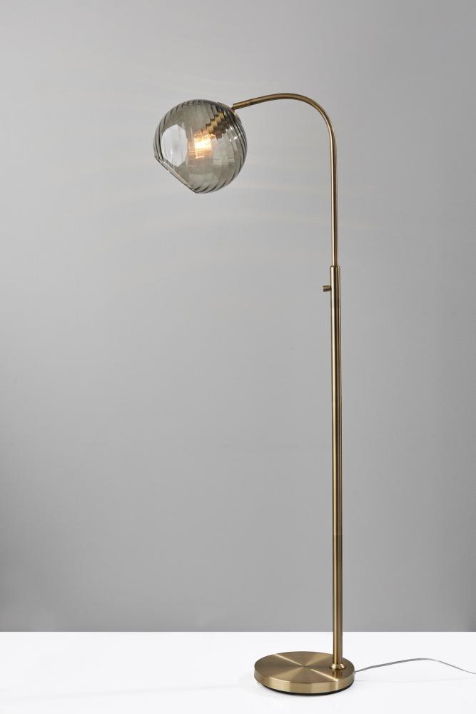 With a blend of contemporary and mid-century modern design elements, the Camden floor lamp imbues any space with warmth and light. A round base with an antique brass finish supports a matching tall tube and gently arcing stem. Suspended from the stem is a 9" diameter globe shade crafted of smoked glass with a delicate swirl pattern. The glass leaves the 60W bulb visible, making a vintage Edison bulb (not included) a striking choice. For added versatility, the base of the lamp shade features an articulation point, allowing you to redirect the shade for a variety of looks and lighting options. Complete your decor with the coordinating Camden flush mount ceiling light, pendant light, wall lamp, desk lamp, and arc lamp.