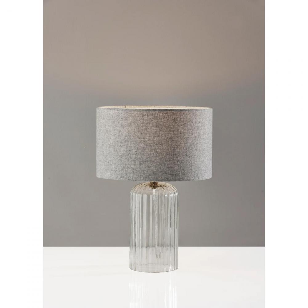 Add a blend of contemporary and coastal style to your home with the Carrie table lamp. With a base of clear ribbed glass offset by an antique brass neck, the stylish design is completed by the drum-shaped soft-touch grey fabric shade. It features a rotary socket switch to easily turn the lamp on or off, and with a 5' long clear cord, this lamp powers a 60W Type A bulb (not included). While this lamp is 16.5" tall and 12" wide, complete your home's décor with the larger Carrie table lamp measuring 22" tall and 14.5" wide.