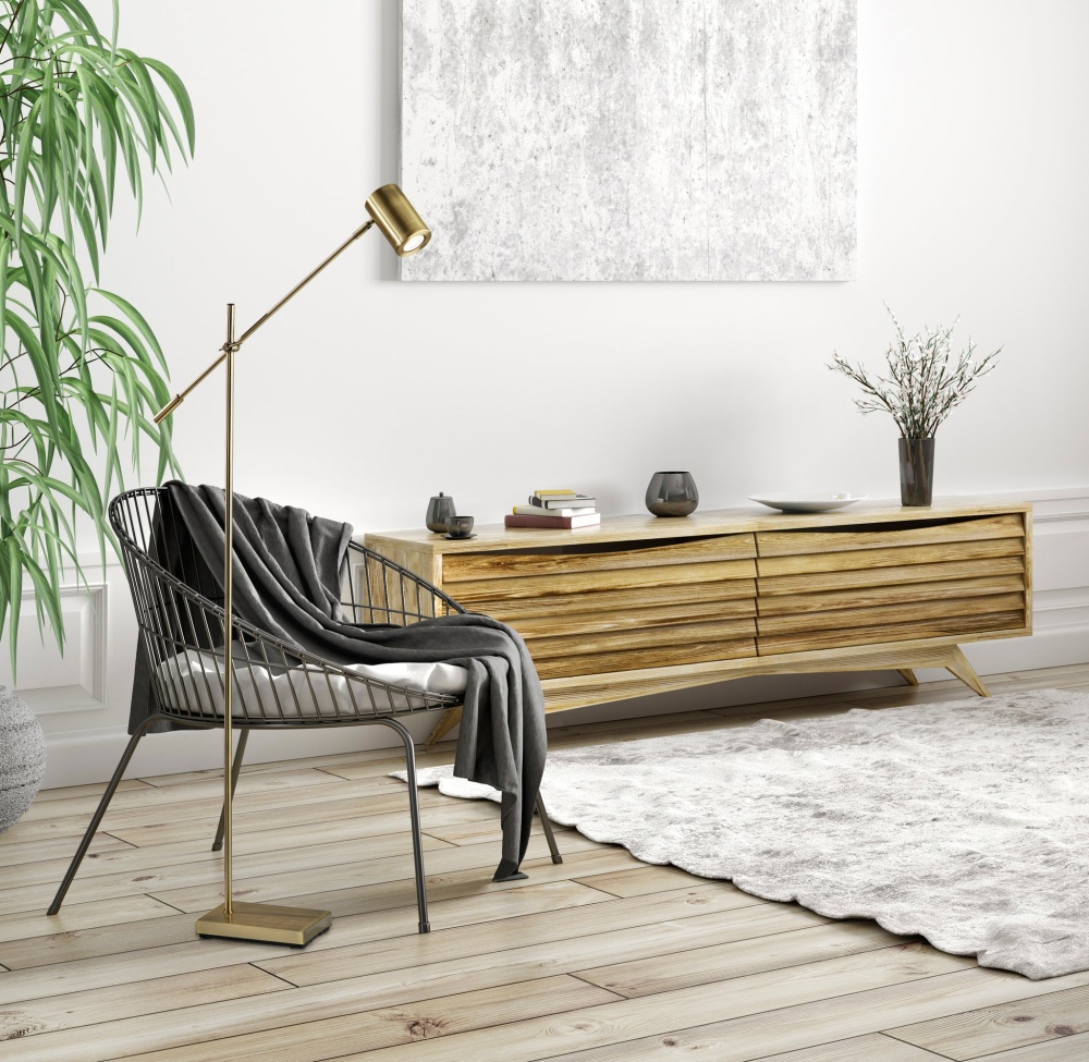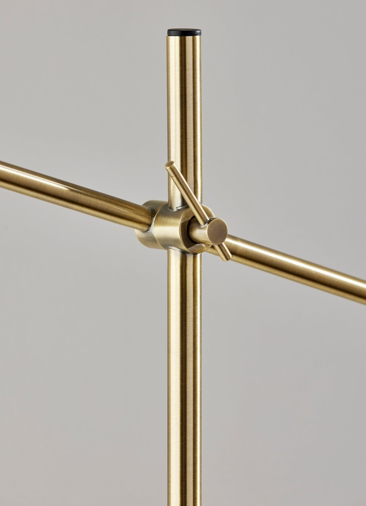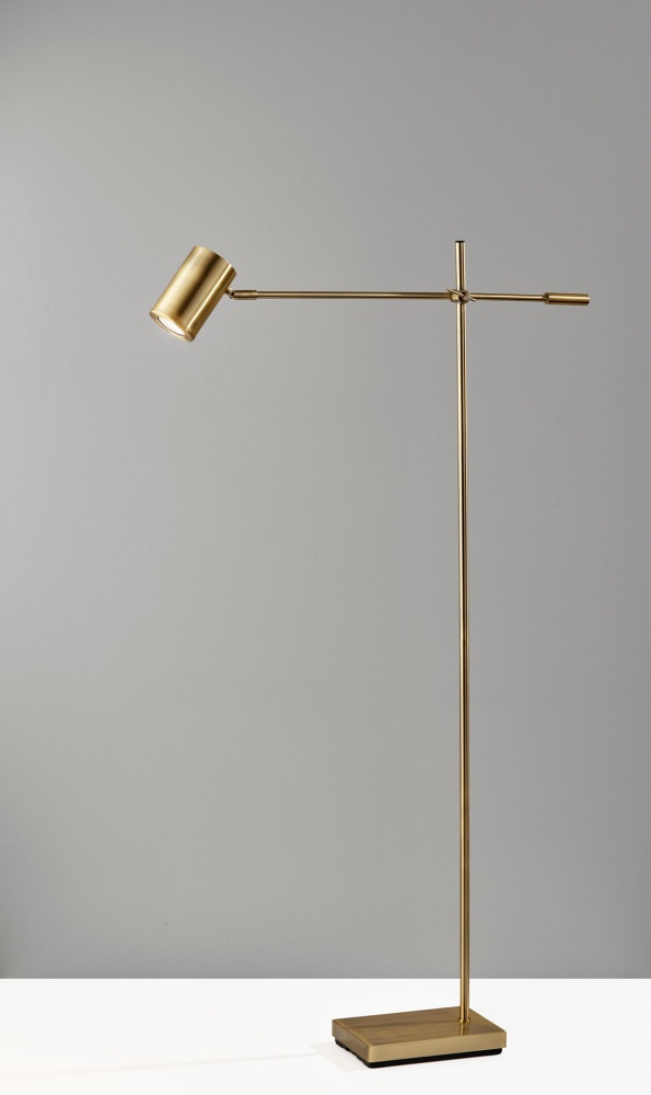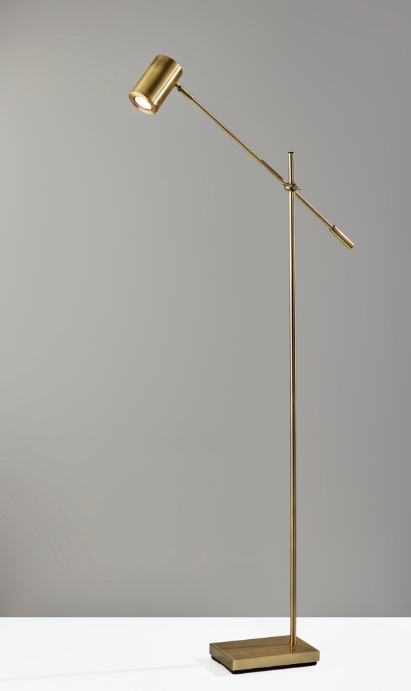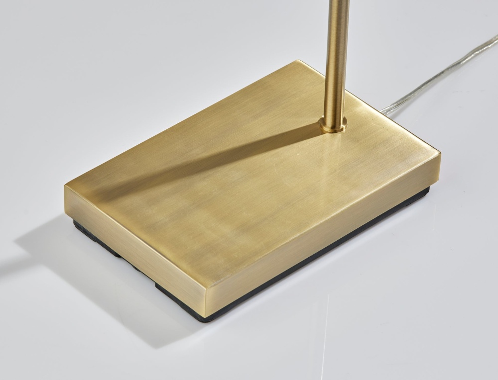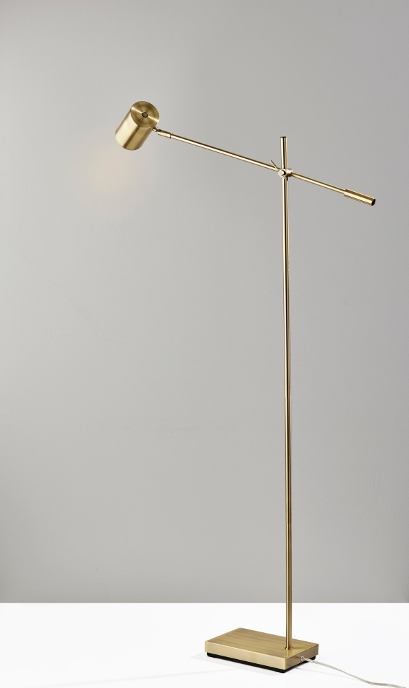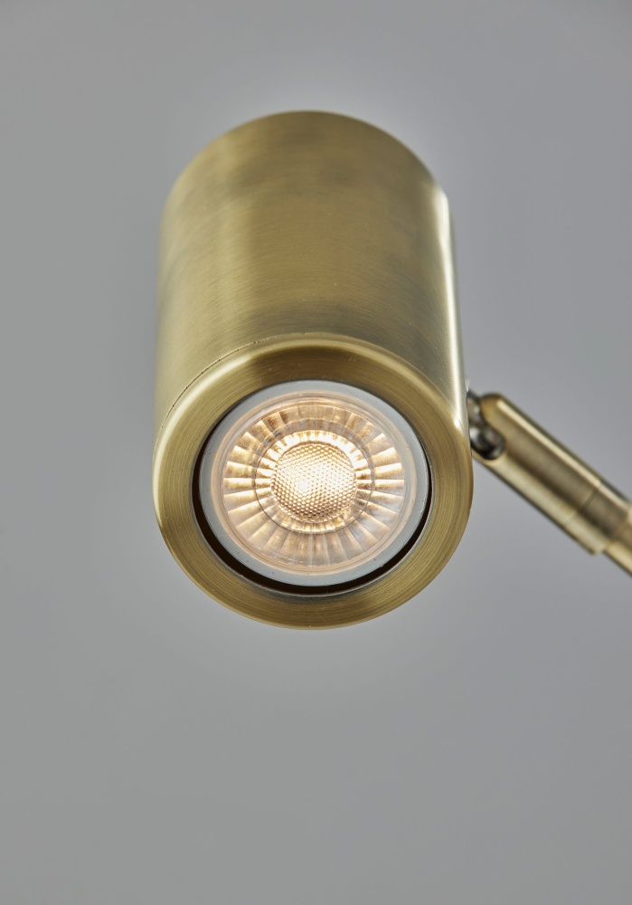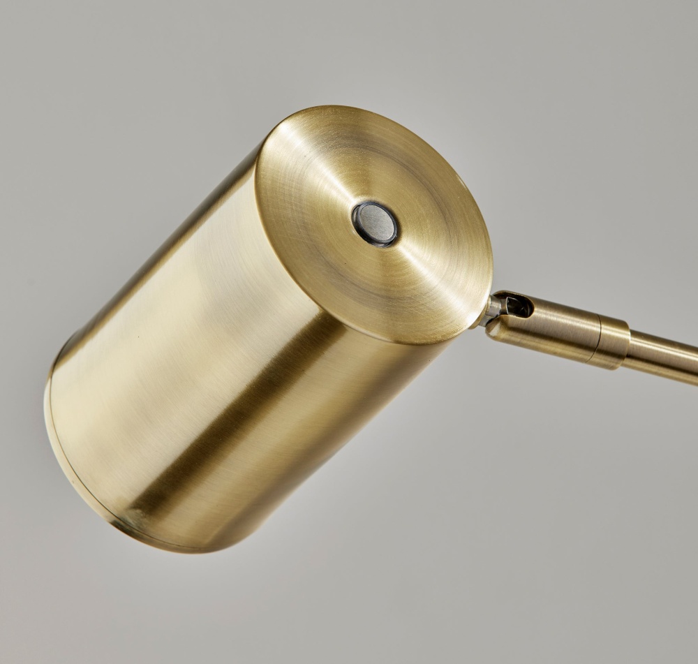 The Collette floor lamp adds modern functionality to mid-century modern design for a versatile addition to any space. Crafted of metal with an all-over antique brass finish, a 10" x 6.5" rectangular base supports a long slim pole that connects to a matching boom arm. An articulation point on the stem adjusts the angle of the arm, allowing you to set a total height of between 58" and 63". A second articulation point at the base of the light shade lets you further adjust the lighting, directing it wherever it's needed. The 5" long and 3.25" diameter cylindrical shade houses a GU10 9W LED light that illuminates your space with 400 lumens of warm light. A touch dimmer switch conveniently located on the back of the shade lets you adjust the brightness between low, medium, and high at the touch of a finger. Complete your decor with the coordinating Collette AdessoCharge LED desk lamp.