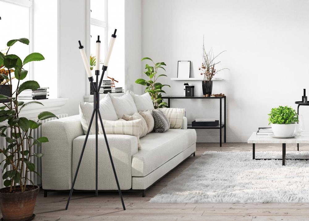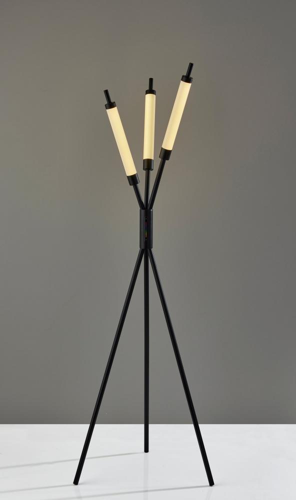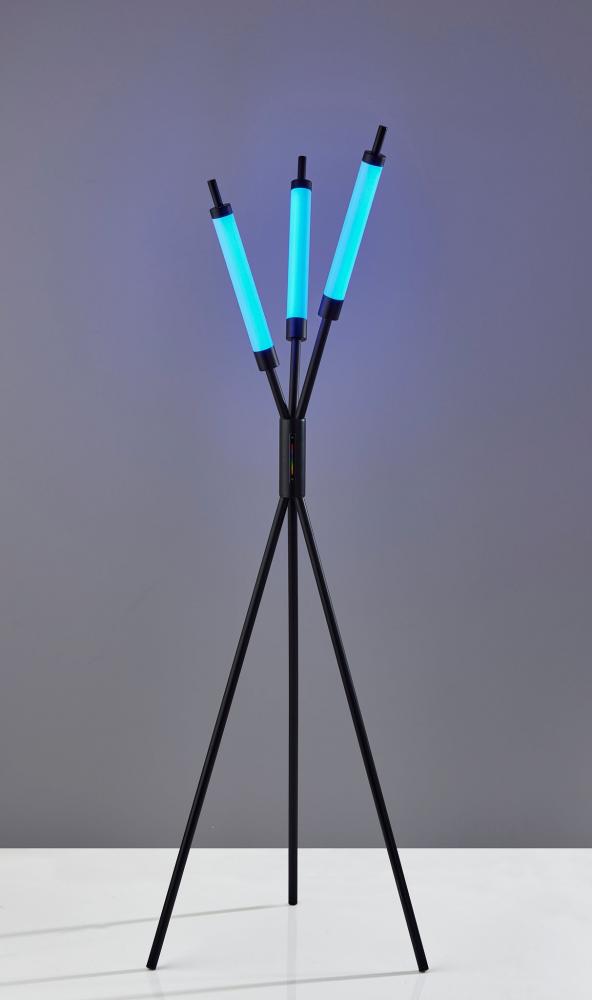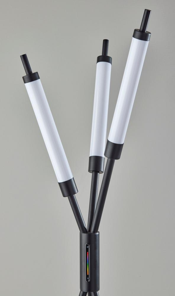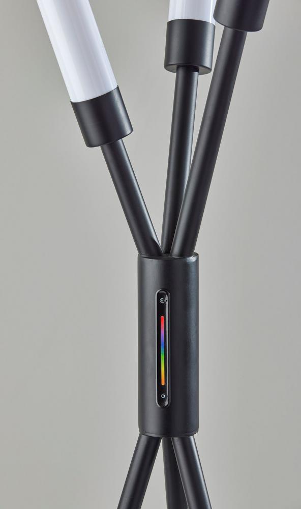 For a modern statement piece that adds vibrant ambient lighting, look no further than the 3 light Collin LED color changing floor lamp. The lamp provides an eye-catching silhouette. Three slender black metal poles rise from a tripod base and crisscross before each leads to a 10" tall slender cylindrical shade measuring 1.5" in diameter. The wide footprint of the lamp and elevated height of the integrated shades make this lamp a perfect choice in room corners or beside couches and love seats. Both economical and versatile, the three integrated 12W eco-friendly LEDs together produce up to 3,000 lumens to brighten your space. Operated by a touch switch conveniently located on the stem, the shades project light in a full spectrum of RGB color and feature three brightness settings all controlled by the touch of a finger. The lamp is also powered by a 5' black cord. Complete your decor with the Collin LED color changing table lamp and the compact design of the Collin LED color changing floor lamp.