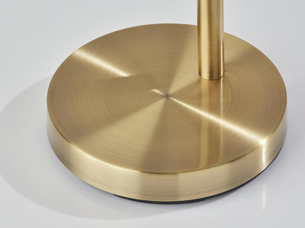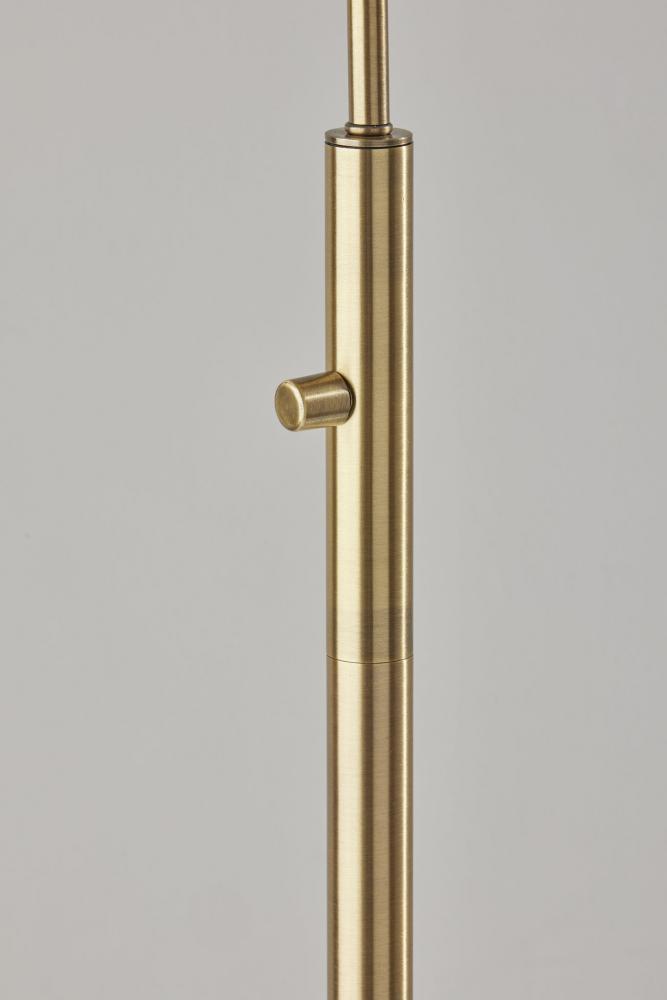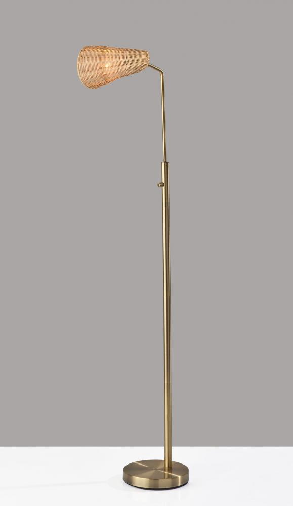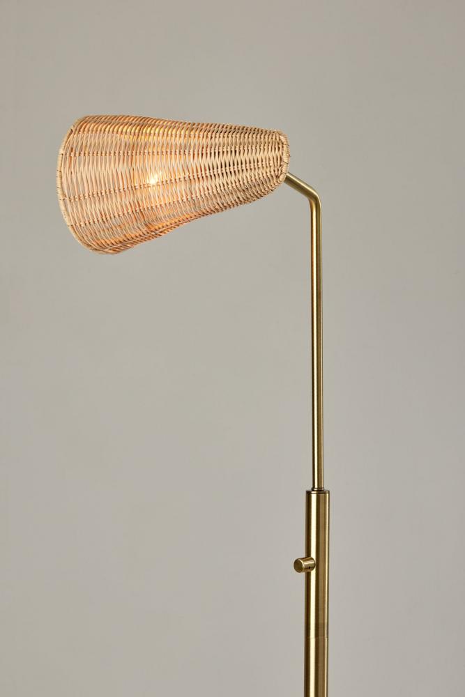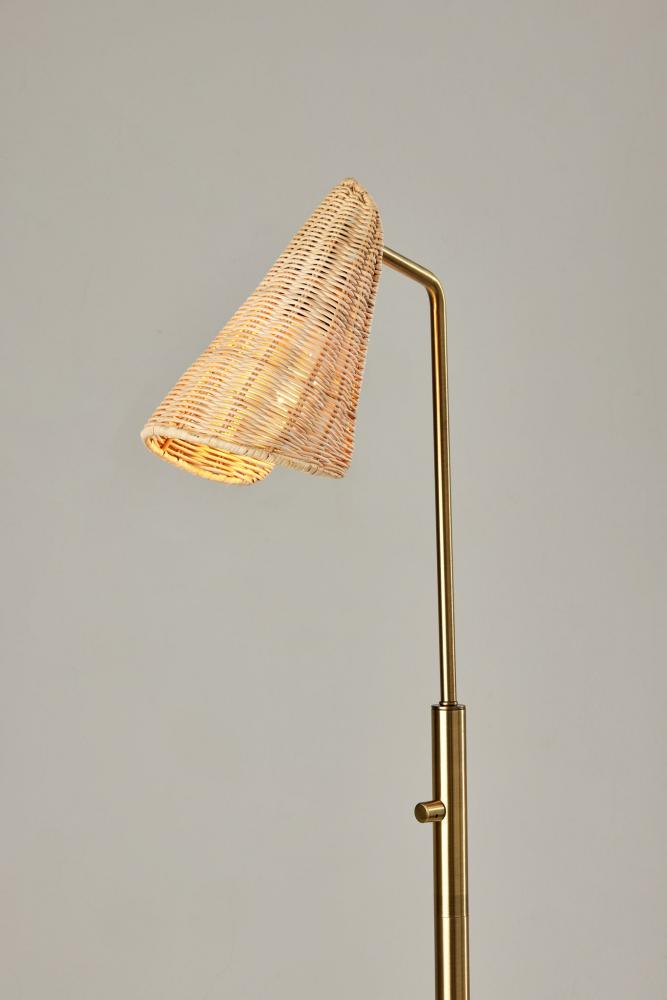 Featuring a blend of natural and modern elements and style lines, the Cove floor lamp adds a distinctive look to any room. With a height of 58" and width of only 9", the compact footprint makes for a perfect lighting choice behind or beside furniture and suits the needs of smaller spaces. The round antique brass base and matching thin stem in clean lines complement mid-century modern decor. Topping the lamp is a hood-shaped shade fashioned of natural rattan material for a unique look. The base of the shade includes an articulation point, allowing you to rotate the shade up or down and side to side to direct the light wherever it's needed. A rotary switch located on the stem allows you to easily turn the 60W bulb on or off, while the lamp is powered by a 5' clear cord. For modern chic or contemporary appeal, the Cove floor lamp is also available with a black metal finish. Complete your space's decor with the coordinating Cove desk lamp and tree lamp.