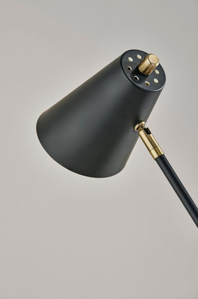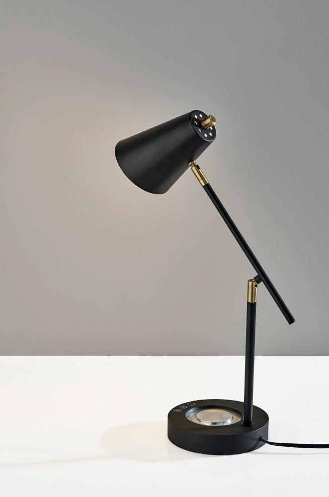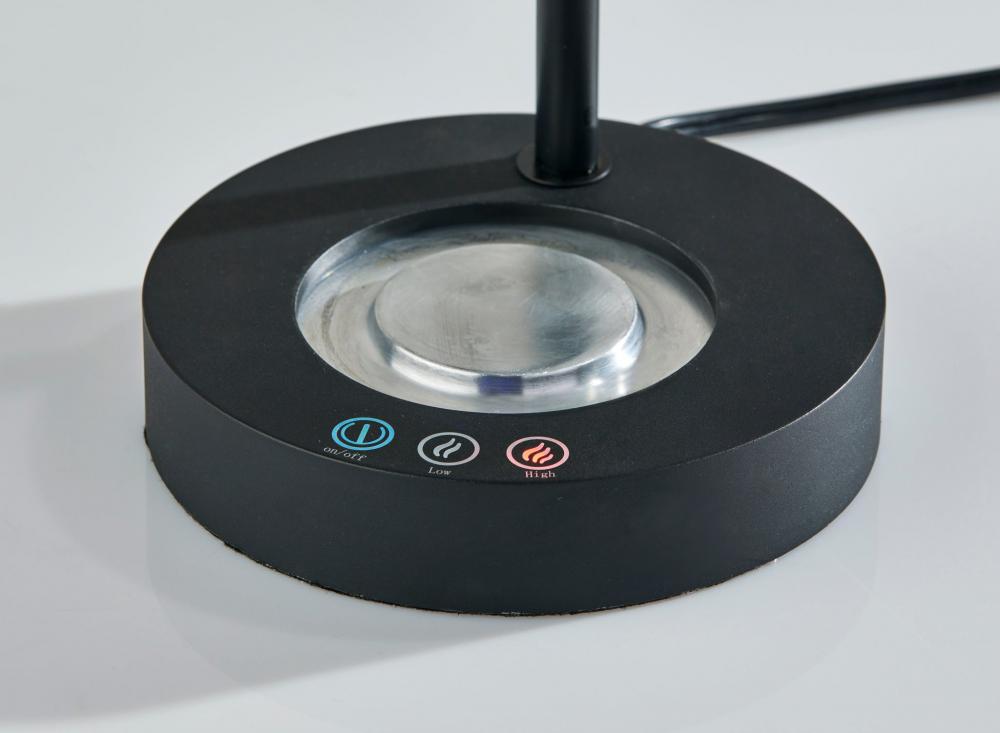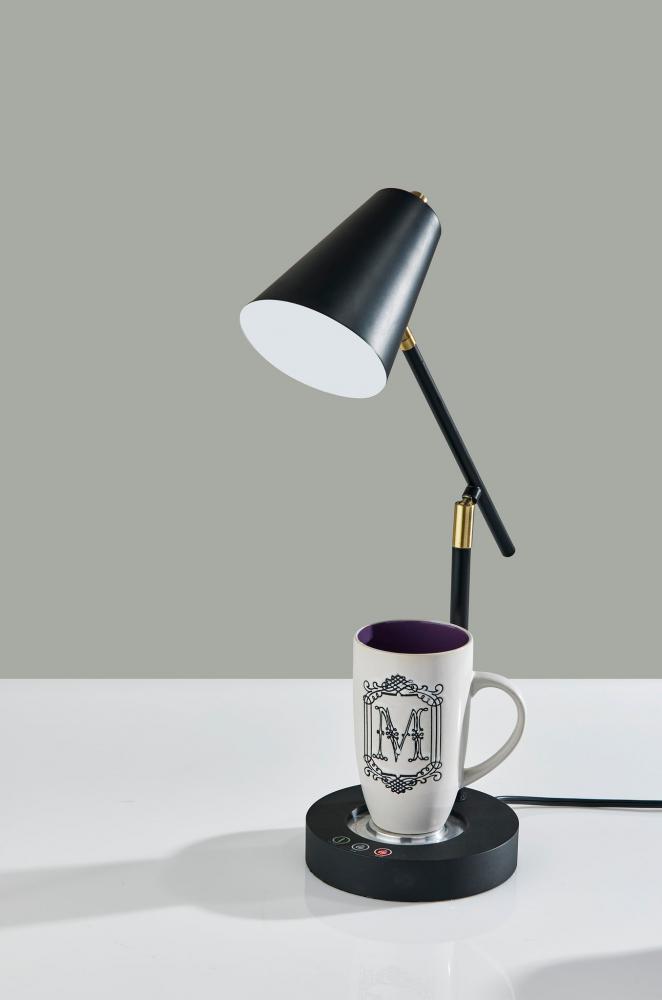 Keep your drink warm while brightening your work space with this mid-century modern desk lamp by Simplee Adesso. With an integrated 3.625" diameter cup warmer built into the base, you can keep your coffee, tea, or other drink warm while you work. Convenient, discreet buttons located on the base adjust the heating setting between high, low, and off, while the cup warmer also includes a one-hour safety timer. The lamp is constructed of black metal with stylish antique brass accents along the slender, two-piece arm and cone-shaped shade. For versatility, both the arm and base of the shade include articulation points, allowing you to adjust the top half of the arm and the shade angle to direct the light wherever it's needed. A rotary switch located on the shade easily turns the 40W bulb on and off, while the lamp is powered by a 5' cord. The desk lamp also provides convenient charging power for your phone, tablet, and other devices. Both a USB port and an AC outlet are located on the back of the base for charging multiple devices simultaneously. The Simplee Adesso cup warming desk lamp is also available with a white, antique brass, or brushed steel finish.
