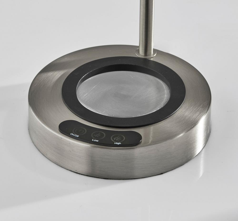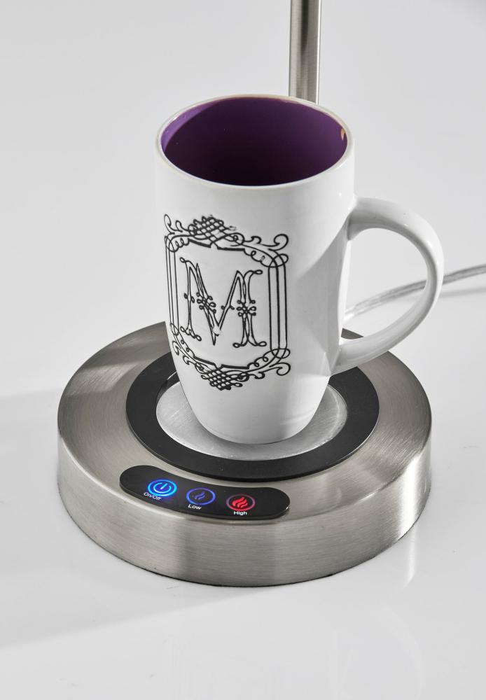 Keep your drink warm while brightening your work space with this industrial-style desk lamp by Simplee Adesso. With an integrated 3.625" diameter cup warmer built into the base, you can keep your coffee, tea, or other drink warm while you work. Convenient, discreet buttons located on the base adjust the heating setting between high, low, and off, while the cup warmer also includes a one-hour safety timer. The round base, slender two-piece arm, and cone-shaped shade are constructed of metal with a brushed steel finish. For versatility, both the arm and base of the shade include articulation points, allowing you to adjust the top half of the arm and the shade angle to direct the light wherever it's needed. A rotary switch located on the shade easily turns the 40W bulb on and off, while the lamp is powered by a 5' cord. The desk lamp also provides convenient charging power for your phone, tablet, and other devices. Both a USB port and an AC outlet are located on the back of the base for charging multiple devices simultaneously. The Simplee Adesso cup warming desk lamp is also available with a white, black, or antique brass finish.