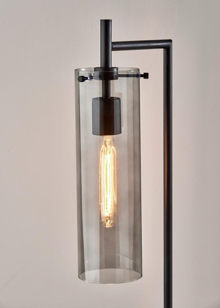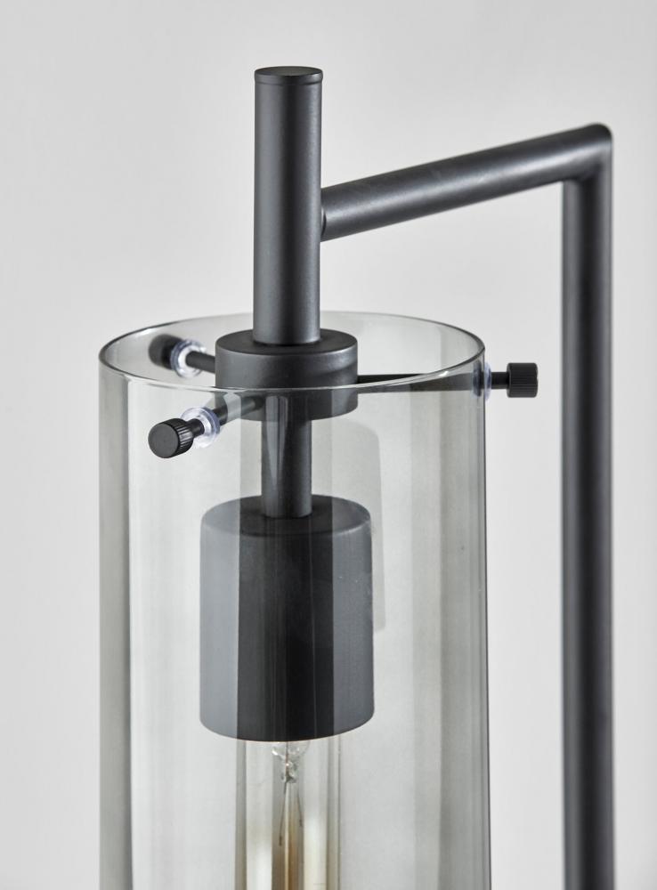 With clean, simple lines, a black metal finish, and vintage Edison bulb, the Dalton desk lamp integrates seamlessly with industrial and modern chic styling. This 24" tall lamp's small footprint and narrow profile make it a space efficient choice for desks, nightstands, and end tables. Anchored by a rectangular base crafted of black metal, a matching narrow pole extends straight before meeting with a short arm at a 90° angle. Suspended from the arm is a luxuriously styled smoked glass cylindrical shade that leaves the included 40W Edison tube bulb visible for striking, vintage appeal. The lamp is easily operated by a discreet rotary switch located on the base. Complete your decor with the Dalton 1-light floor lamp, 2-light floor lamp, wall lamp, and pendant light.