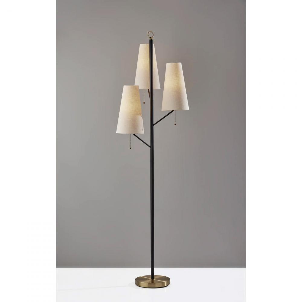 Brighten your room with a modern, industrial flair with the 71" Daniel floor lamp. The clean silhouette, large offset shades, and combination of black and antique brass finishes create an understated yet stylish look. The lamp features a black metal body, with coordinating antique brass finish on the base and top. Three arms present linear lines at offset heights leading to tall cream textured fabric shades. Each light is operated by a pull chain to easily turn the 40W bulbs (not included) on or off independently of each other, and the floor lamp features a black 5' cord. Complete your interior design with the matching Daniel table lamp.