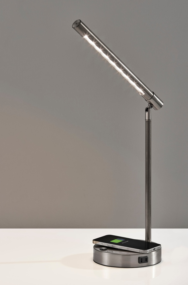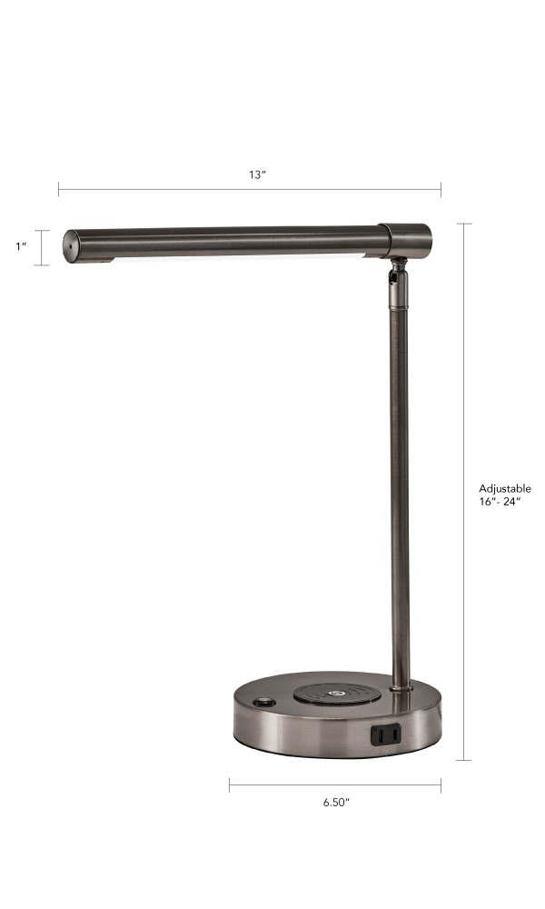 Introducing the 2611-22 Dax LED Wireless Charging Desk Lamp, a sleek and modern addition to any workspace. With a brushed steel finish and streamlined metal tubular shade, this lamp offers both style and function. The adjustable height, ranging from 16" to 24", allows for customized positioning, while the 9W integrated LED with a 3-level touch step dimmer provides personalized lighting. Equipped with a 10W wireless charging pad, a 2 Amp AC outlet, and a USB port, the Dax Desk Lamp combines lighting and charging convenience, perfect for powering up all your essential devices.