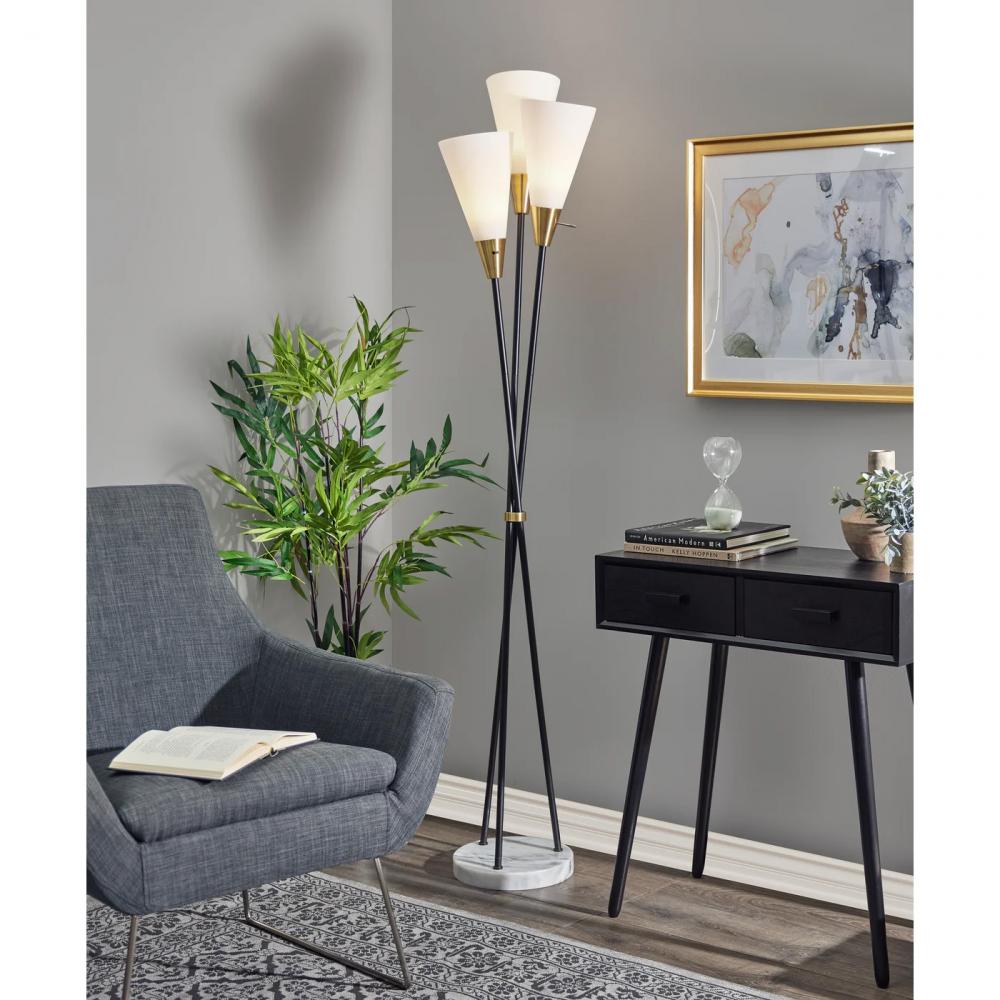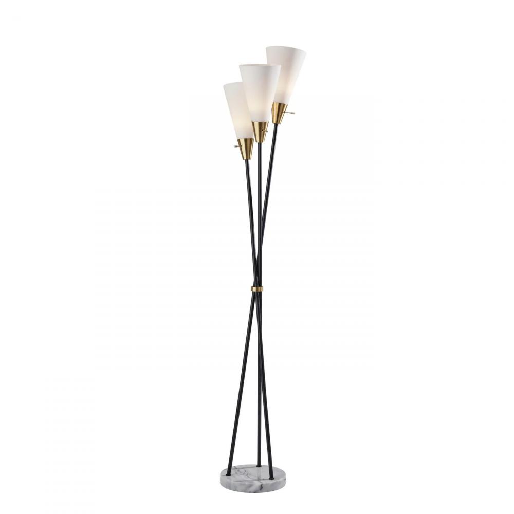 The Dixon 3-light torchiere floor lamp combines high quality materials to create a unique modern chic design. The 72" tall and 15" deep lamp makes for the perfect addition to bedrooms or living spaces. An 11" round white marble base supports three long poles in a black metal finish, intersecting in the middle with an antique brass accent piece. Each pole is topped by a frosted glass cone-shaped shade with an antique brass base. Each 100W bulb (not included) is operated by a rotary switch located on the sockets. Complete your decor with the coordinating Dixon combo torchiere floor lamp.