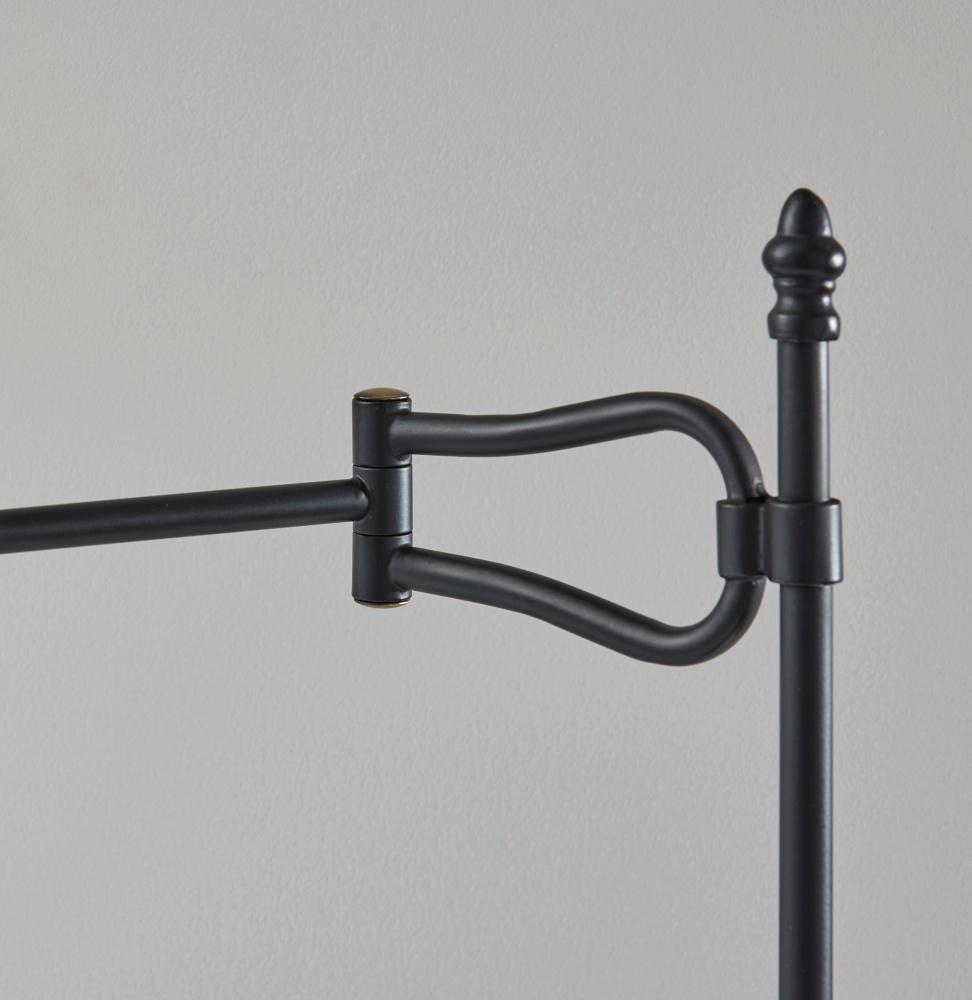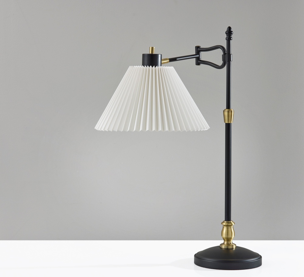 Meet the 3968-01 Elijah Table Lamp, a striking blend of contemporary design and vintage-inspired accents. Its sleek black finish with antique brass accents exudes sophistication, while the pleated off-white fabric shade adds a touch of elegance. The highlight of this lamp is its swing arm adjustability, allowing you to direct light exactly where you need it. Standing at 27.5 inches tall, it's the perfect addition to your bedside table, desk, or living room side table. With an on/off rotary switch conveniently located on the socket, controlling the lighting is effortless, making the Elijah Table Lamp both stylish and functional