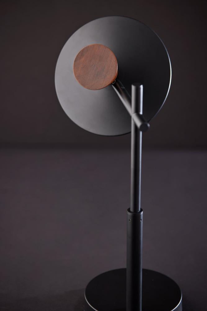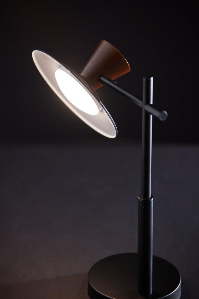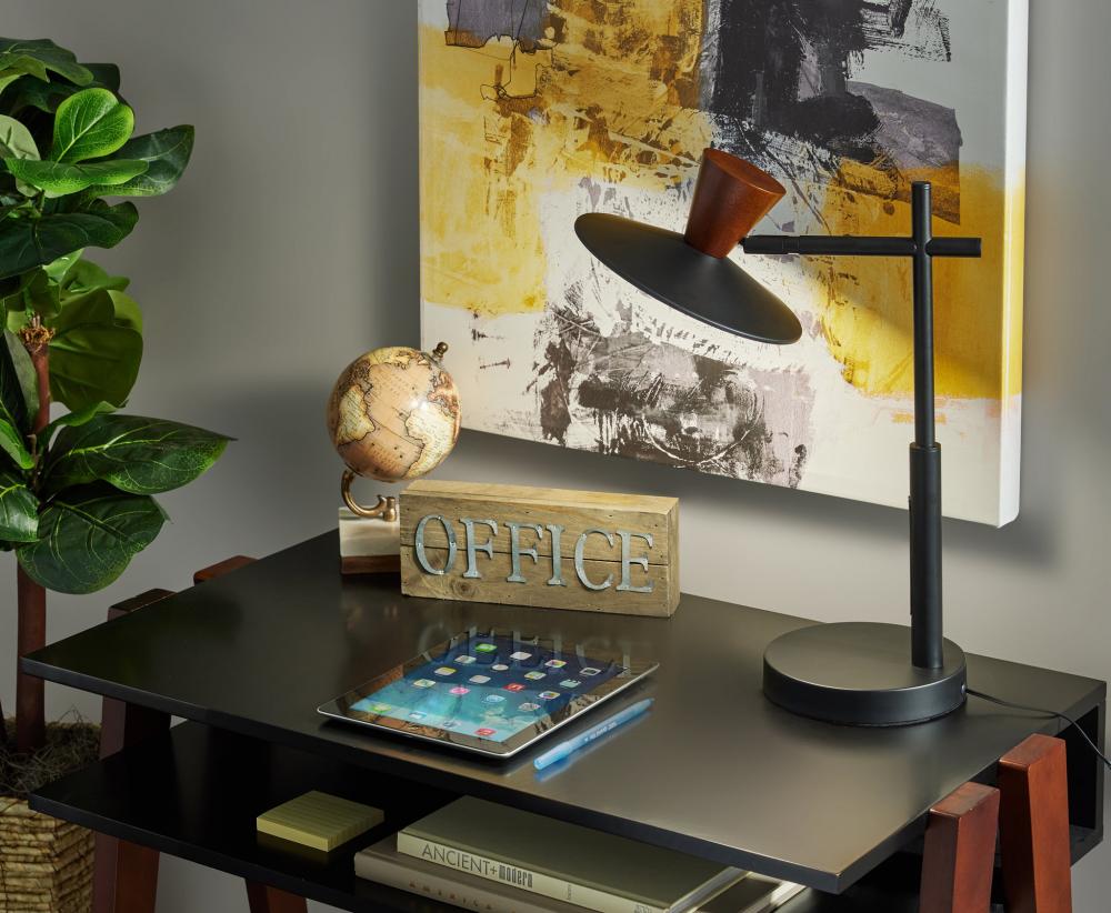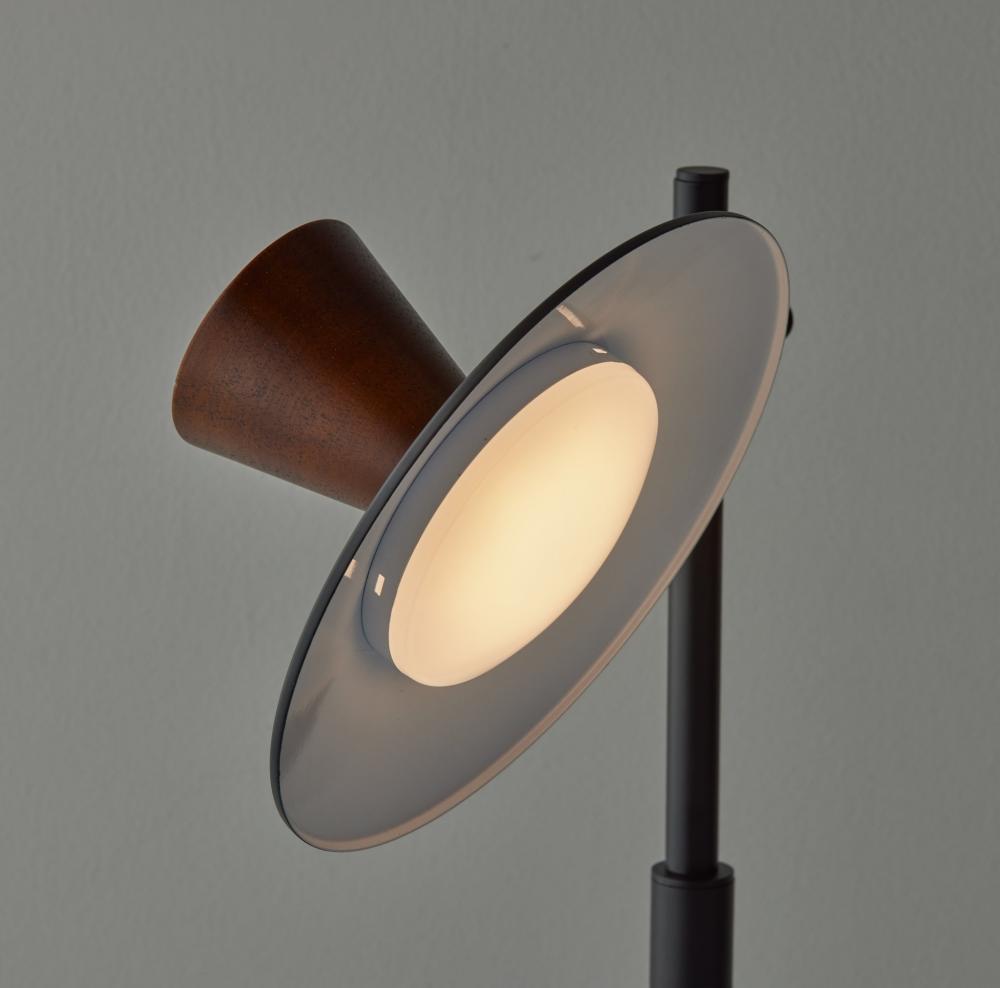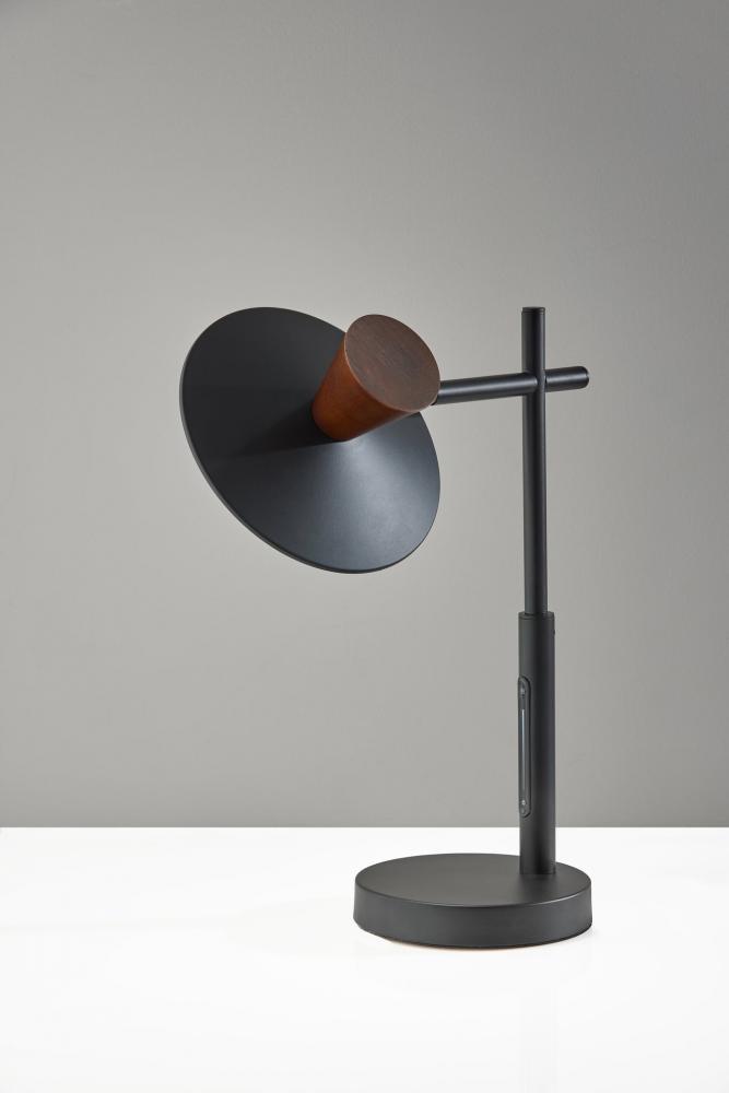 Elegant and modern, the 16.5" tall Elmore LED desk lamp adds contemporary, functional style to your workspace. The walnut wood accent brings warmth to the black metal construction, while the blend of geometric patterns creates visual interest. The 8" diameter shade can be adjusted and redirected to focus the light wherever it's needed and also features an integrated 8W LED light that is economical and eco-friendly. Operated by a smart switch built into the stem, the Elmore desk lamp provides highly versatile lighting at the touch of a finger. For optimum adjustability, the smart switch controls a full-range dimmer and 5 color temperature settings to match the LED brightness and temperature to your activity and the time of day. Complete your space's decor with the coordinating Elmore LED floor lamp and tree lamp.
