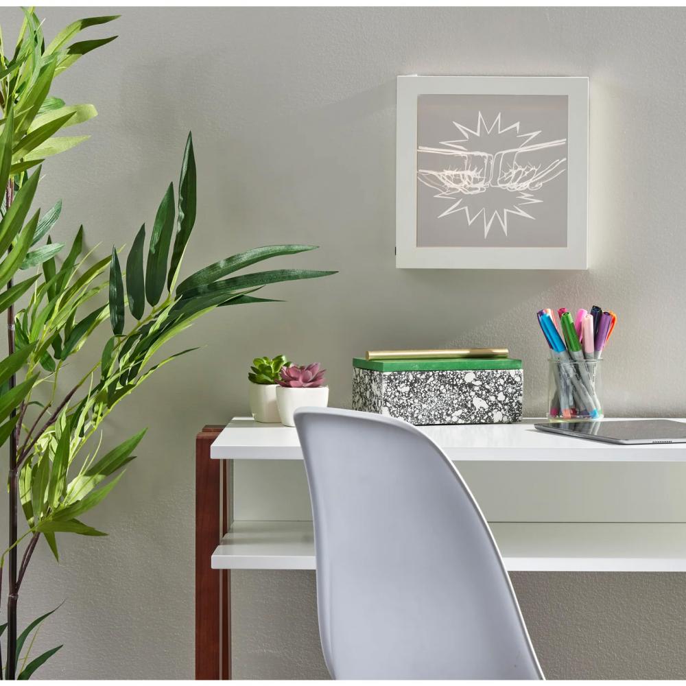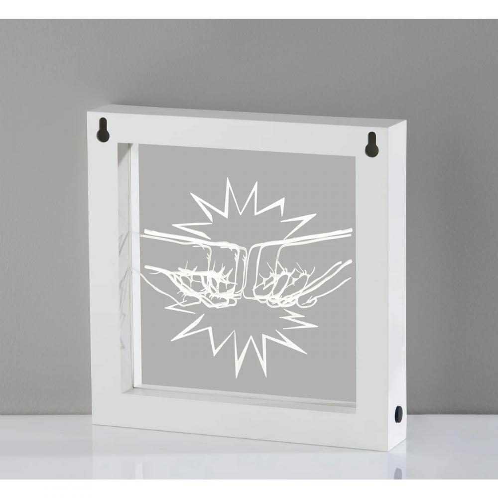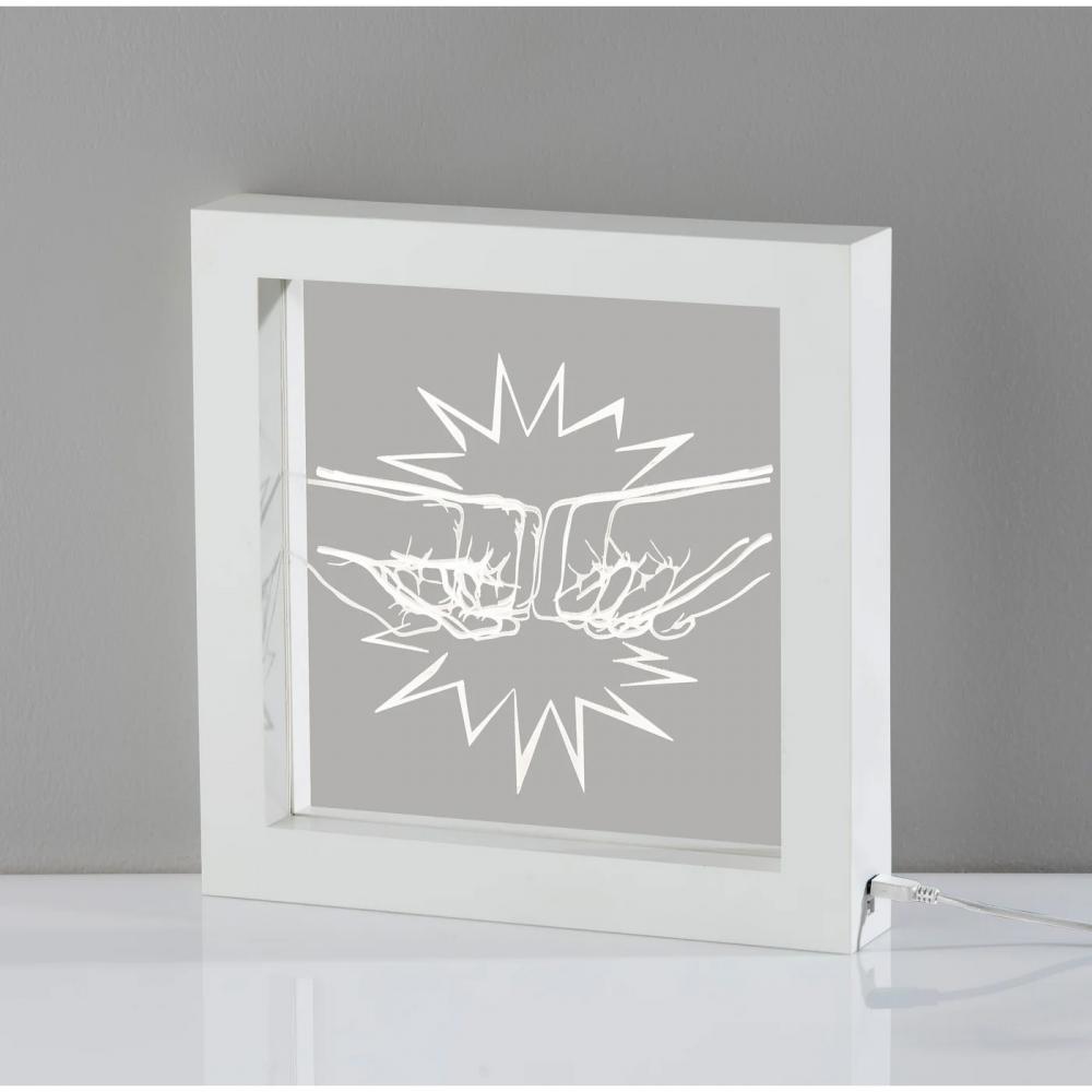 Feel the power with this abstract Fist Bump Video Light Box by Simplee Adesso, which can be wall mounted as eye-catching wall art or can stand free on tables, shelves, nightstands, or counters. Measuring 9" tall by 9.25" wide including a white plastic frame, this light box includes a 7.25" square window with art illuminated in white LED light. The light can be easily turned on or off with a push button switch. The 0.3W LED can be powered by either 3 "AA" batteries (not included) for a clean, wire-free aesthetic. Alternatively, the light box can be powered using the included 8' USB cable for unlimited use without needing to worry about replacing batteries.