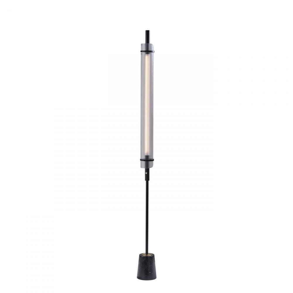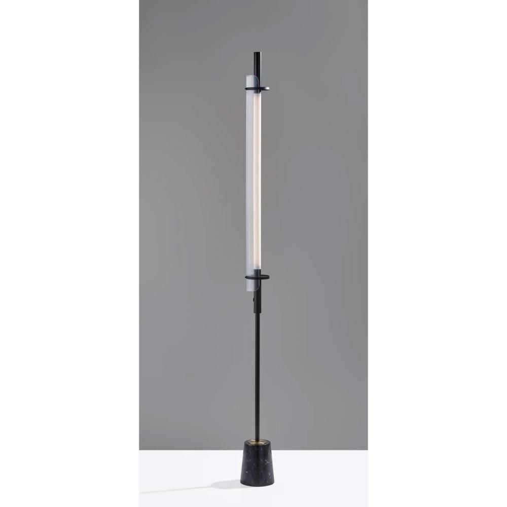 Illuminate your room with the modern styling and symmetrical curves of the Flair LED floor lamp by ADS360. With its sleek, compact design and sophisticated materials, this 8W LED lamp will become the focal point of your space. It features a 7" tall luxurious black marble cylindrical base topped with an antique brass metal disc leading to a tall, slender, tube-shaped metal stem in black finish. The tall integrated LED tube produces 500 lumens that are softly distilled by the 4" wide curved diffuser made of clear ribbed acrylic. The diffuser is artfully attached to the lamp by two 4" diameter metal rings in black finish. The floor lamp is operated with a touch switch located on the stem, allowing you to change the lighting setting between low, medium, high, and off at the touch of a finger, and features a 5' black cord. Complete your space's look with the coordinating Flair LED table lamp.