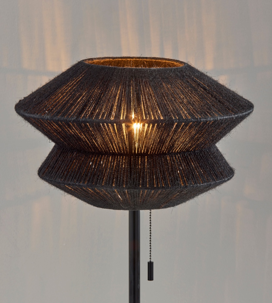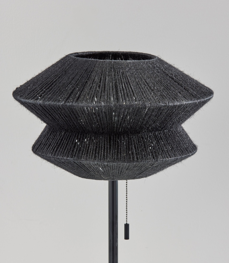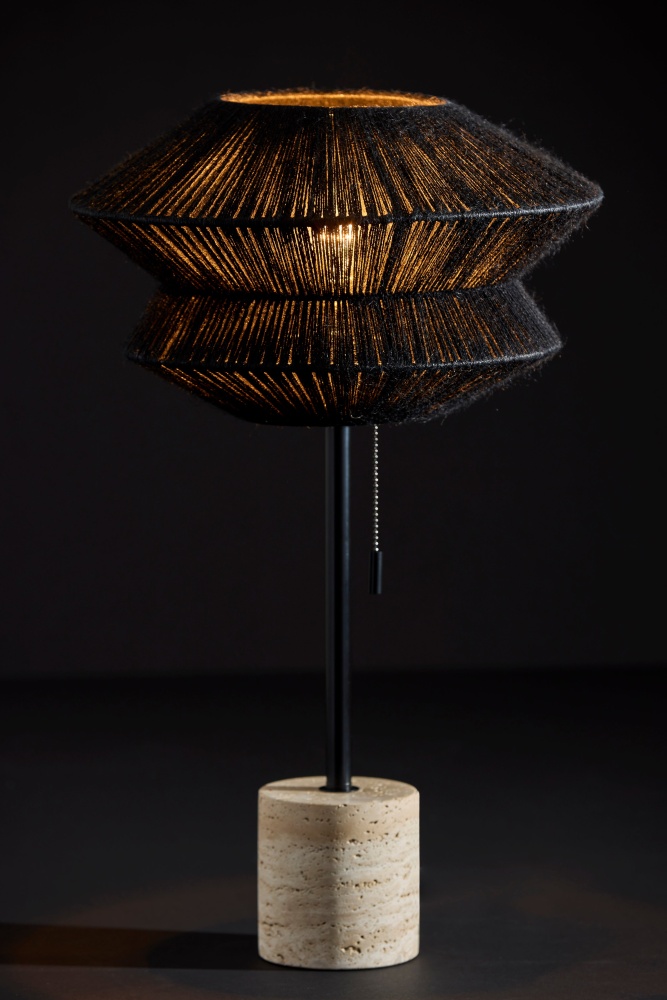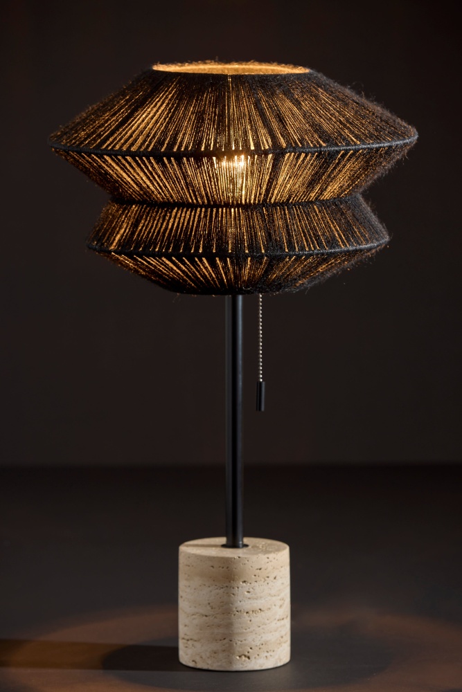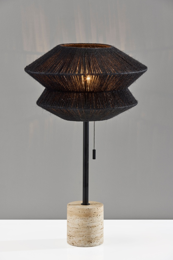 Introducing the 3869-01 Gardner Table Lamp, where contemporary design meets natural elements for a striking lighting piece. With its sleek black finish, the lamp offers a modern aesthetic that effortlessly blends with any decor style. The origami-shaped black rope shade adds an intriguing geometric dimension, while the chunky travertine stone base provides stability and a touch of rustic charm. At 14" in height, this lamp is the perfect addition to desks, bedside tables, or accent tables, offering both functionality and style.
