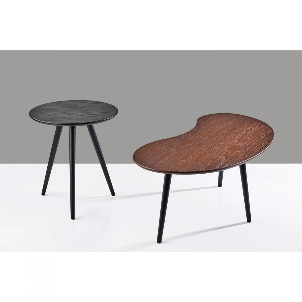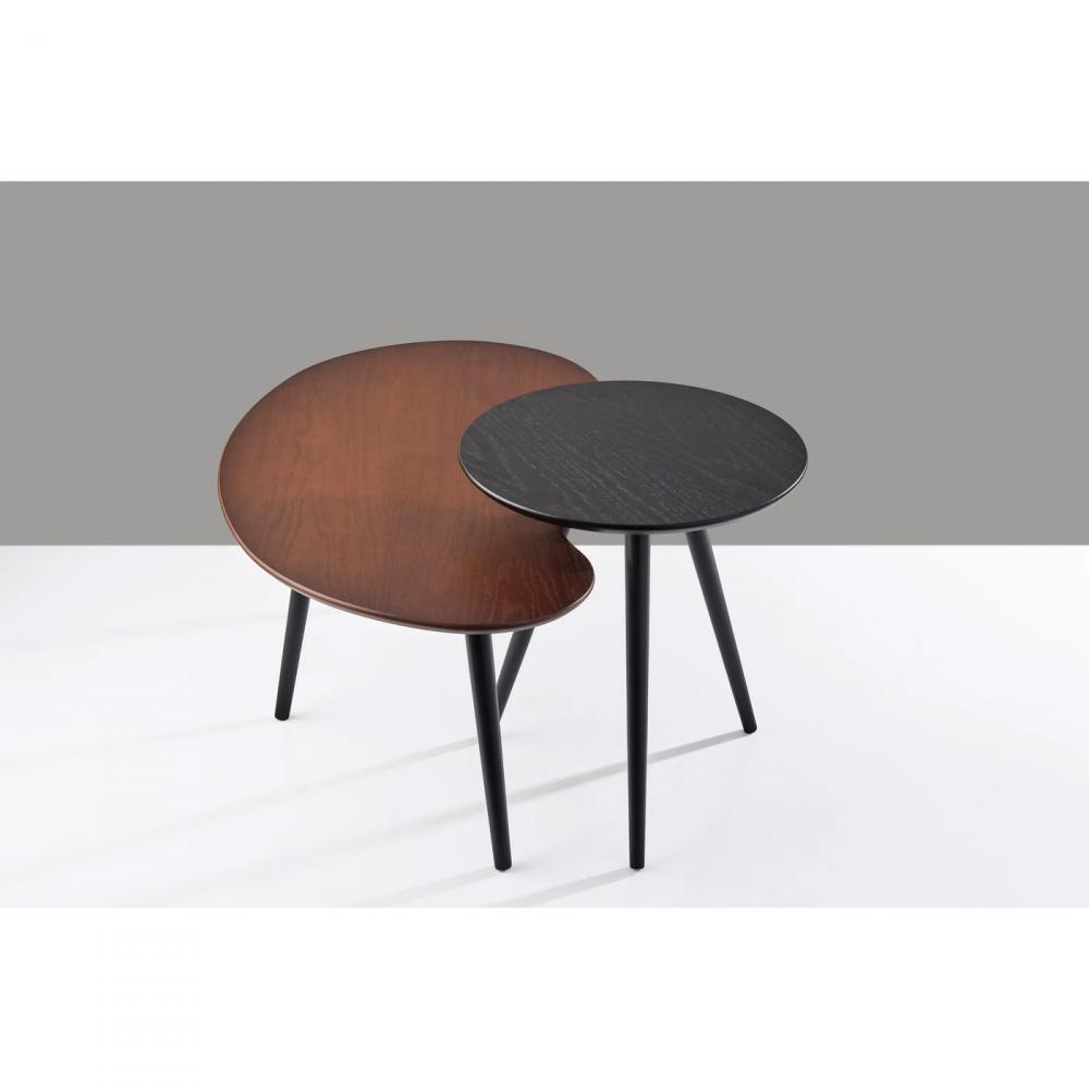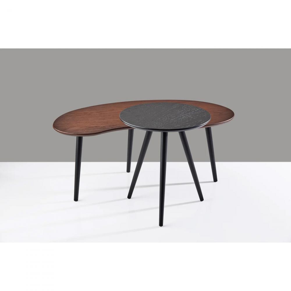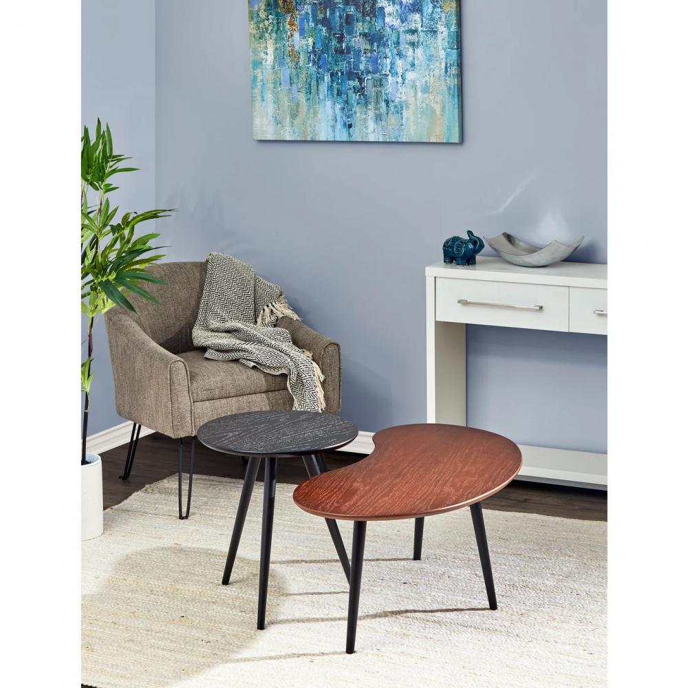 Add contemporary style to your living room, bedroom, or home office with this set of two Gilmour nesting tables. These tables complement each other perfectly, both in their shape and finish. The larger table has a walnut finished oak veneer top and a unique shape that adds elegant curves, while the smaller round table has a black finished oak veneer. Both tables feature black tripod rubberwood legs. With heights of 15.625" and 19.625", these tables can be used together or separately, making them a versatile addition that is ideal for smaller spaces.