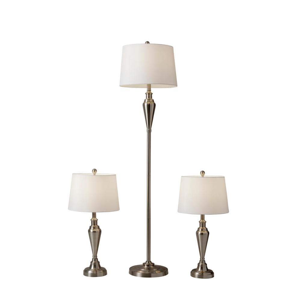 This elegant brass finished lamp set will make the perfect addition to your home. It comes with two table lamps and one floor lamp. It has a fine antique brass finished base with a textured white linen hardback shade. Each lamp takes a 150 Watt bulb or LED/CFL 3-way equivalent.