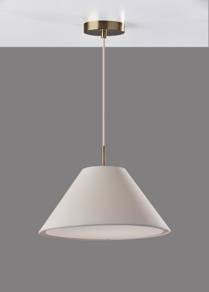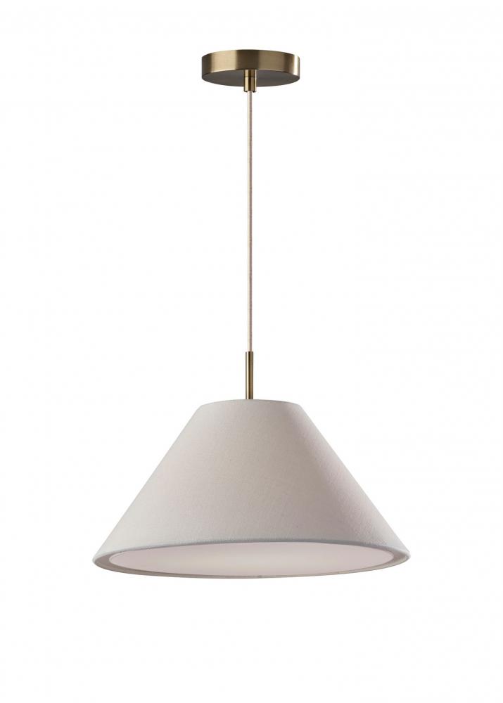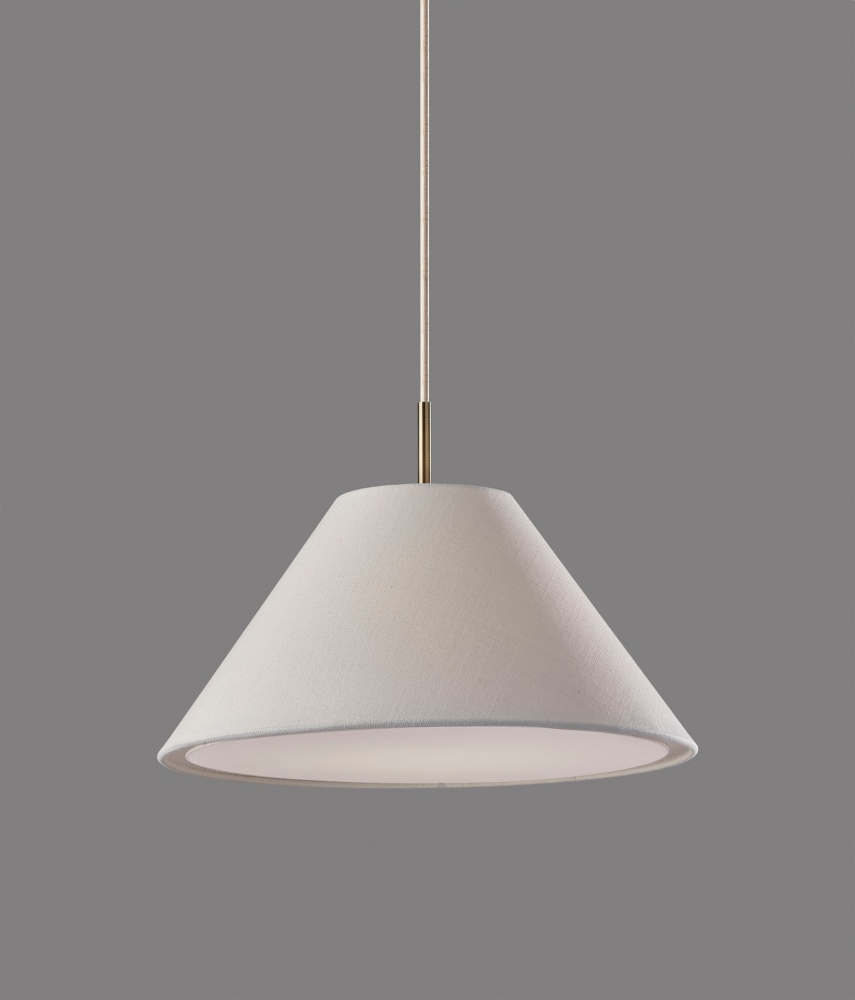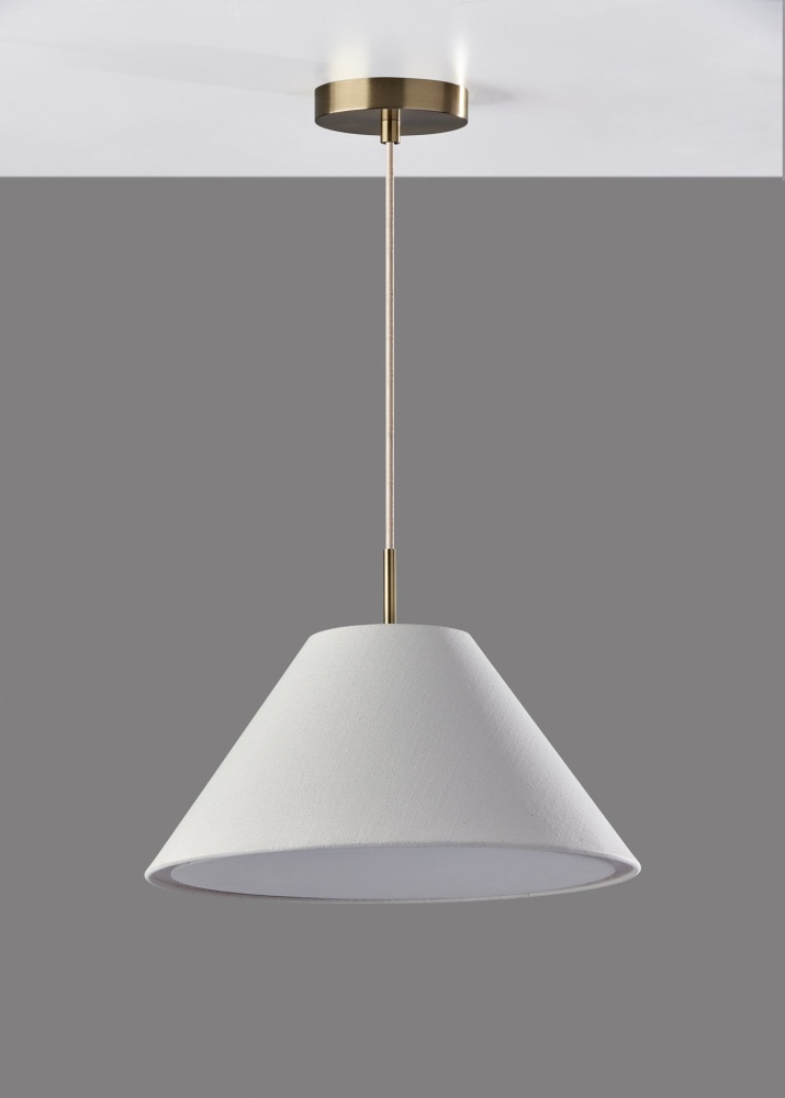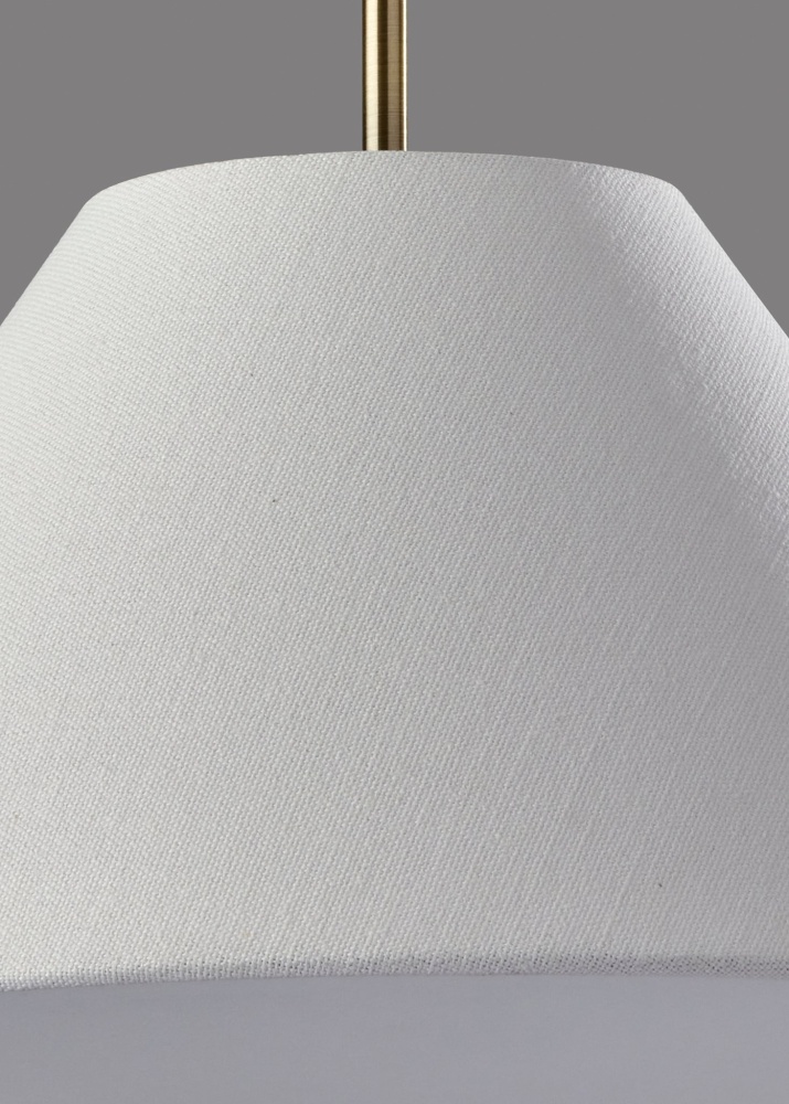 Illuminate your space with the warm lighting and modern chic style of the Hadley pendant light. Hang it by itself or pair it with several more to create a stunning effect and add illumination to your kitchen, dining area, or bedroom. The tapered white textured shade features clean style lines, while the white fabric diffuser softly distills the light from a 60W bulb (not included). Connected to the shade by an antique brass accent piece is a 15' white fabric cord, allowing you to adjust the height of the lamp to suit the needs of any room regardless of the ceiling height. The pendant is suspended from a 5" antique brass round canopy base. The Hadley pendant light is also available with a light brown or light grey shade.