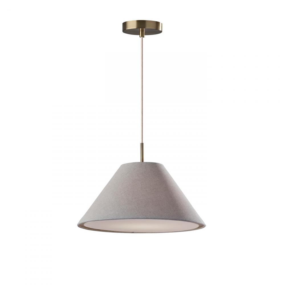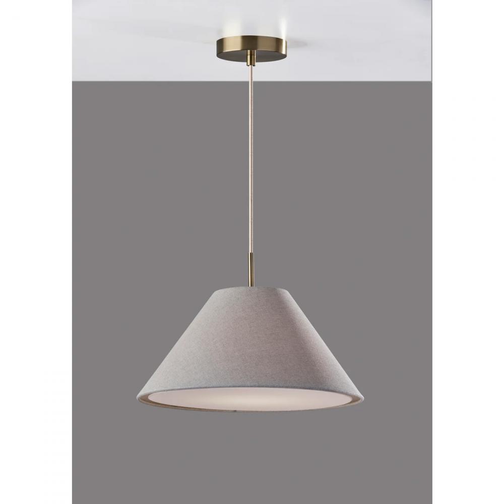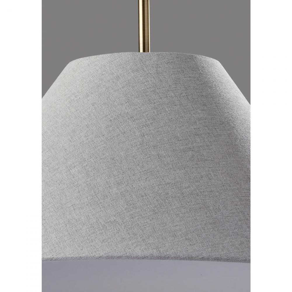 Illuminate your space with the warm lighting and modern chic style of the Hadley pendant light. Hang it by itself or pair it with several more to create a stunning effect and add illumination to your kitchen, dining area, or bedroom. The tapered light grey textured shade features clean style lines, while the white fabric diffuser softly distills the light from a 60W bulb (not included). Connected to the shade by an antique brass accent piece is a 15' white fabric cord, allowing you to adjust the height of the lamp to suit the needs of any room regardless of the ceiling height. The pendant is suspended from a 5" antique brass round canopy base. The Hadley pendant light is also available with a light brown or white shade.