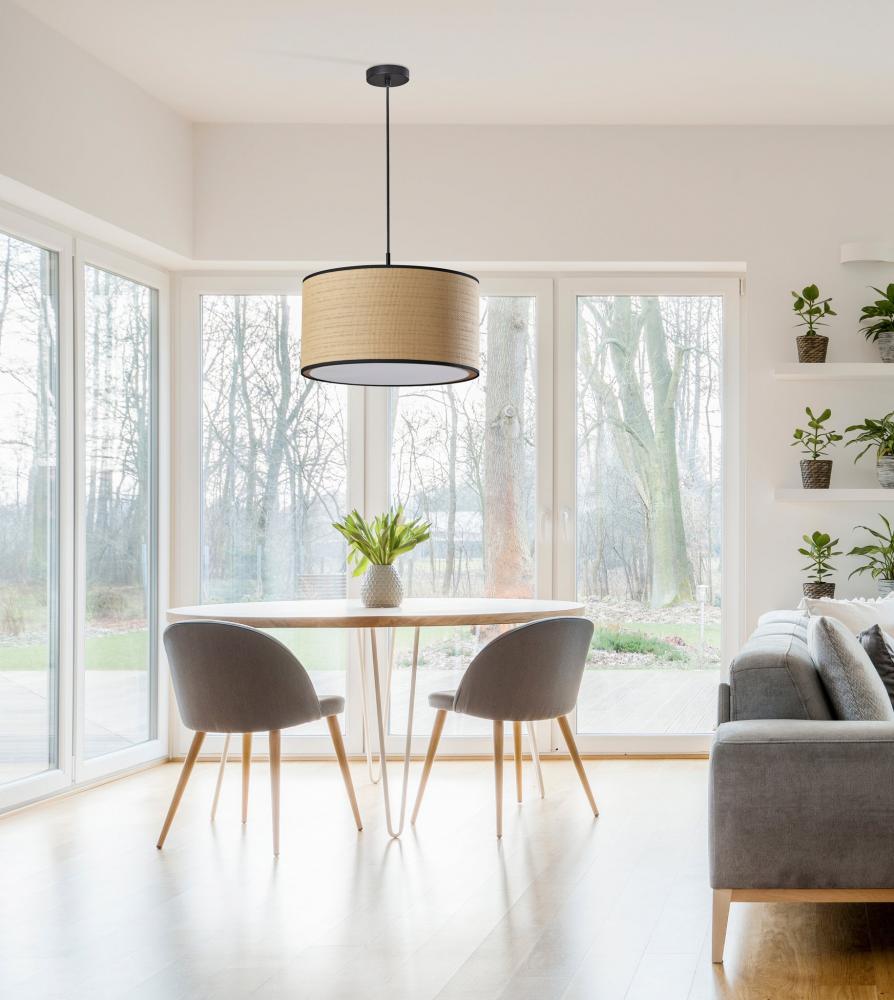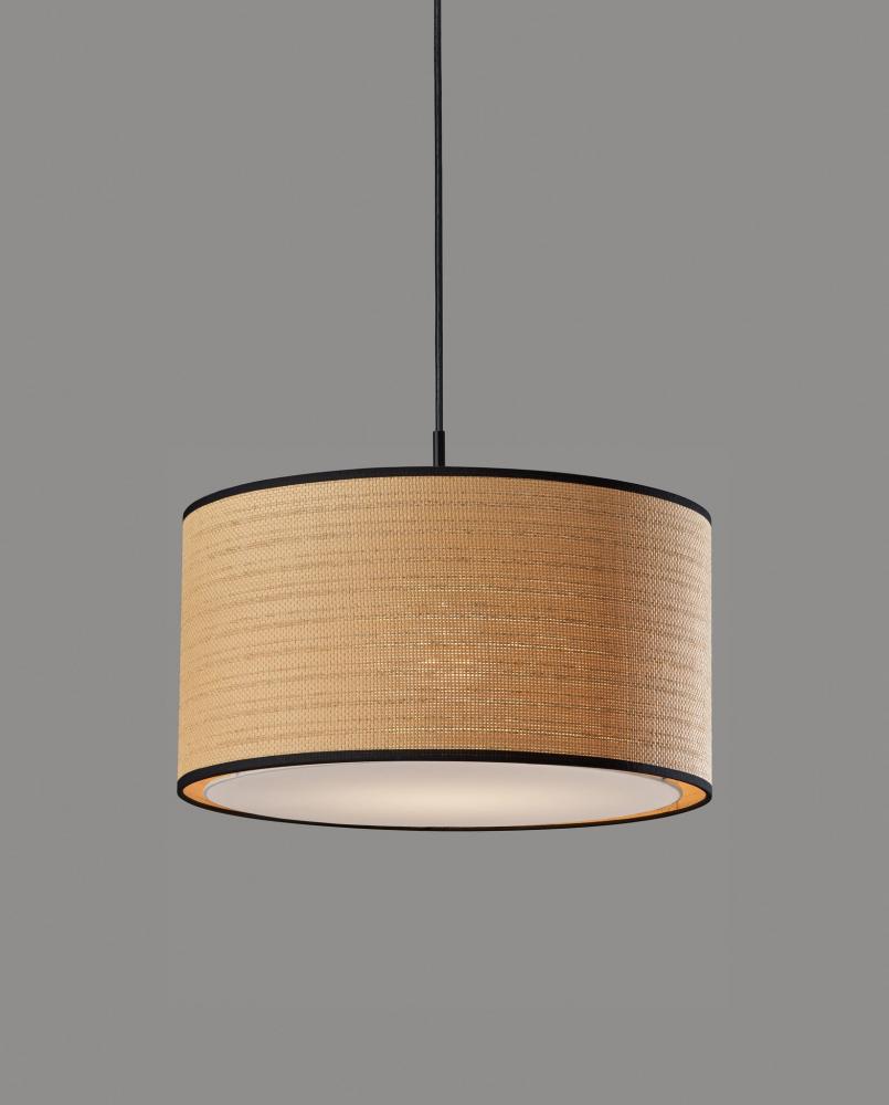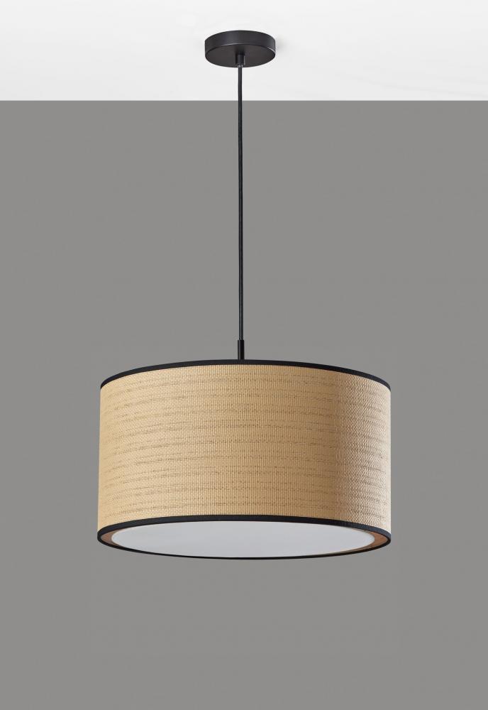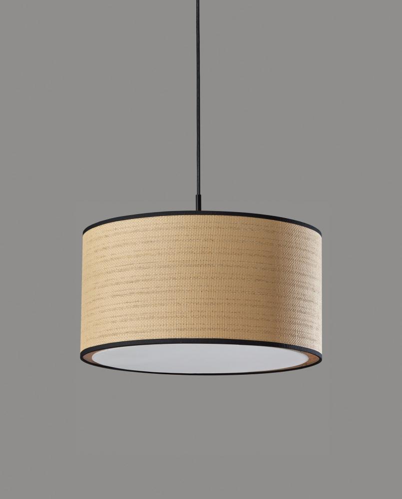 Big and bold, the Harvest large pendant light is an eye-catching piece bringing coastal design and warm lighting to your space. Measuring 20" in diameter and 10.75" tall, this pendant light is best used individually as a statement piece for your kitchen, dining area, or bathroom. Made of natural woven paper and trimmed with black fabric along both the top and bottom, the cylindrical shade adds stylish texture, while the white diffuser softens the light from a 100W bulb. This pendant light also features a 5" diameter round black metal base that complements the black shade trim. With a long, 15' black fabric-covered cord, the pendant height can be installed and adjusted to suit the needs of any room regardless of the ceiling height or can be used as portable lighting. Looking for a more neutral color palette? The Harvest large pendant light is also available with an antique brass base and white cord. To suit the needs of any sized room, Adesso also offers a smaller version of this pendant light with a shade measuring 15" in diameter.