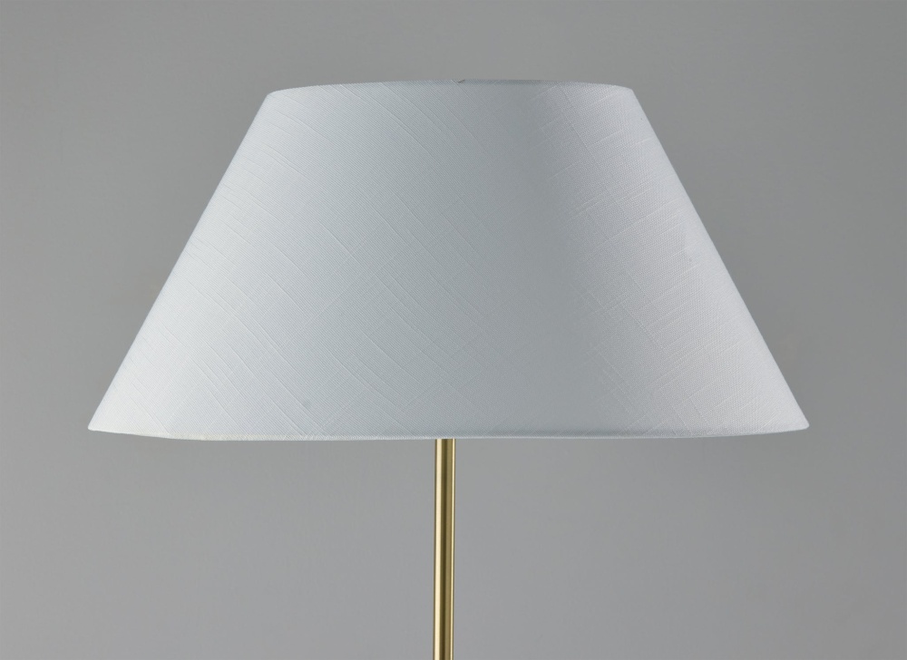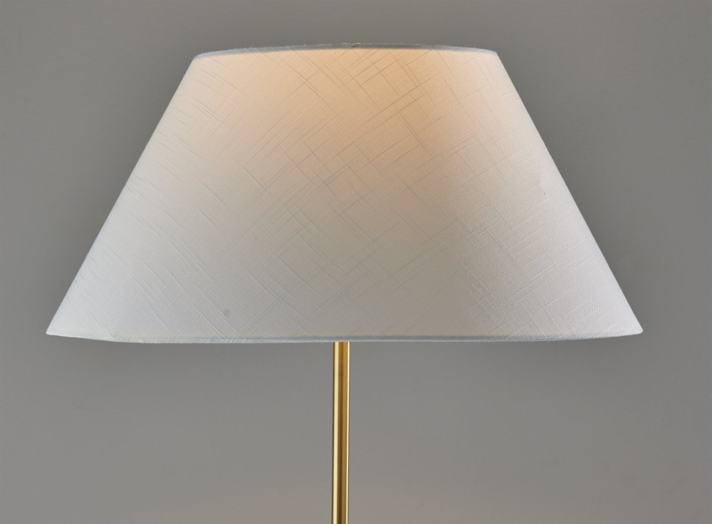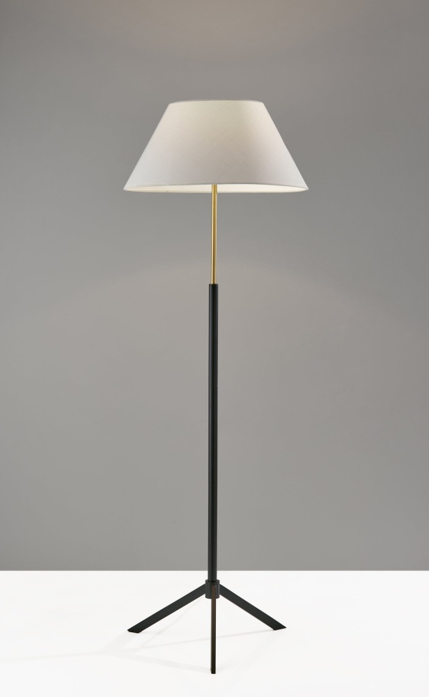 With a stylish blend of materials and striking tripod design, the Harvey floor lamp brings modern chic vibes to any room and is perfectly suited for bedrooms, offices, or living areas. The triangle base in black metal finish continues up the pole before transitioning to a slender brass tube. Topping the lamp a is modified drum shade measuring 10" tall and 19.5" wide. The white linen shade adds soft texture to the contrasting metal lamp construction and diffuses the light with a warm glow. Featuring a 3-way rotary switch, light from a 100W bulb can be set to low, medium, high, or off to always bring the ideal level of brightness to your space. Complete your decor with the coordinating Harvey table lamp.