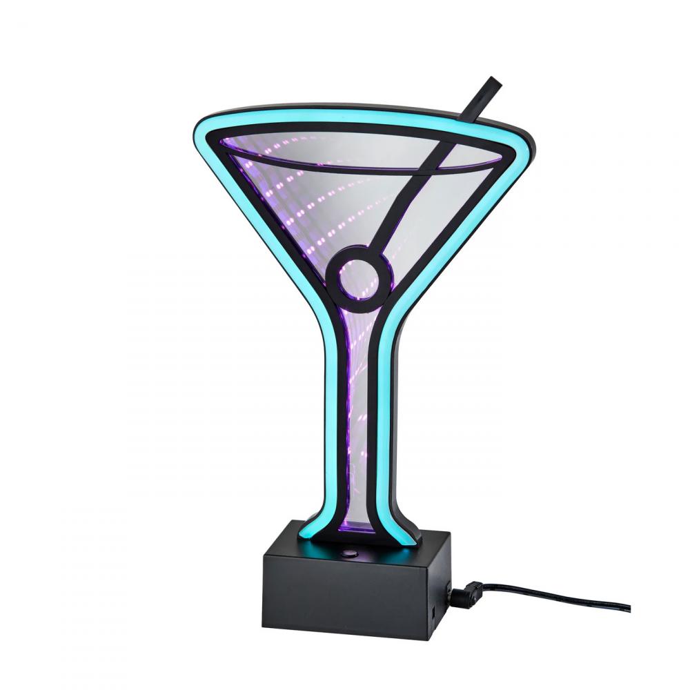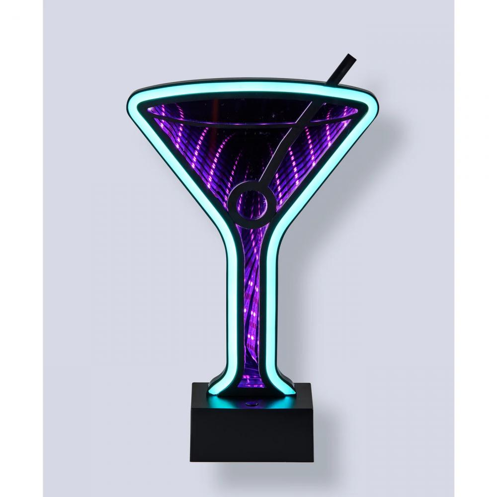 It's never too early for a drink with this bold Simplee Adesso Infinity Neon Martini Glass light that brings a retro feel with a modern twist to any space. Its black, rectangular plastic base houses three "AA" batteries (not included), making it easy to add a fun and stylish glow to any table, desk, or shelf without the mess of a cord. You can alternatively power the light with the included 8' USB cable for unlimited use without needing to worry about replacing batteries. For added versatility, the light comes with mount holes located on the back of the base for mounting to a wall, creating contemporary wall art. Made of mirrored plastic with a neon border, this 10" high and 6.25" wide piece includes a 1W LED light operated by a 4-way push button switch, letting you alternate between a solid neon blue border light only, infinity psychedelic purple all-over light only, or both lights. Even with the light powered off, the stylish martini glass detail creates an eye-catching vintage look and can function as a