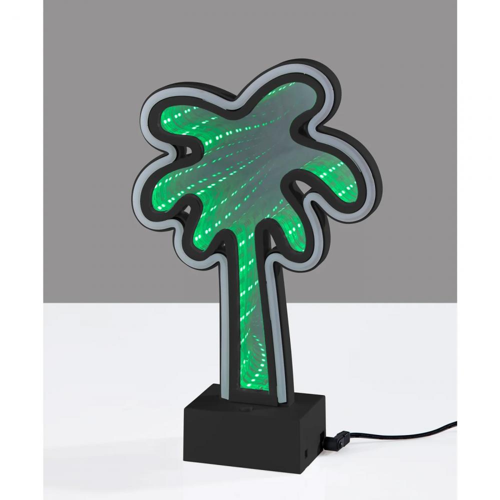 Enjoy tropical vibes with this bold Simplee Adesso Infinity Neon Palm Tree light that brings a retro feel with a modern twist to any space. Its black, rectangular plastic base houses three "AA" batteries (not included), making it easy to add a fun and stylish glow to any table, desk, or shelf without the mess of a cord. You can alternatively power the light with the included 8' USB cable for unlimited use without needing to worry about replacing batteries. For added versatility, the light comes with mount holes located on the back of the base for mounting to a wall, creating contemporary wall art. Made of mirrored plastic with a neon border, this 10.5" high and 6.5" wide piece includes a 1W LED light operated by a 4-way push button switch, letting you alternate between a solid neon yellow border light only, infinity psychedelic green all-over light only, or both lights. Even with the light powered off, the stylish palm tree detail creates an eye-catching retro look and can function as a mirror.