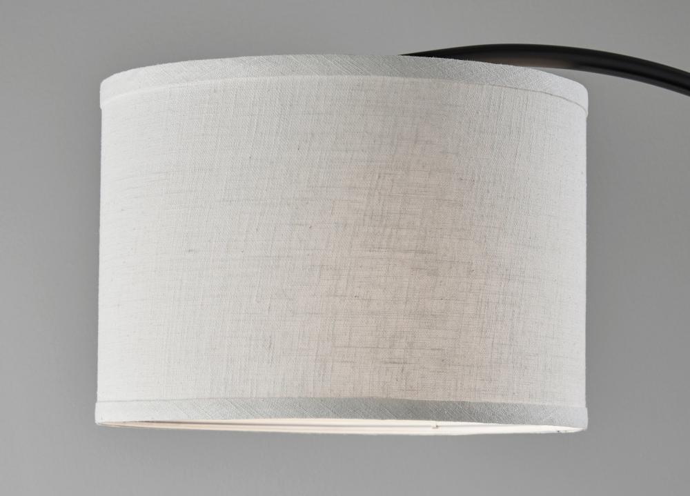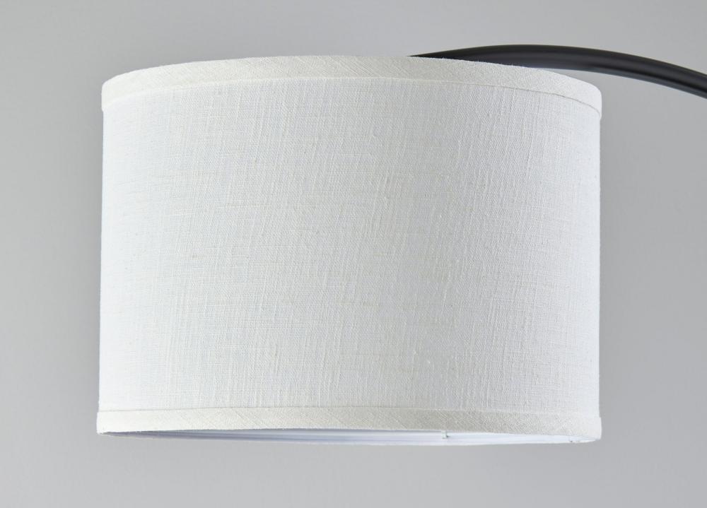 The 64" tall Jace floor lamp by Simplee Adesso stylishly illuminates a seating area with overhead lighting that can be controlled with an adjustable shade. The slightly arcing design of this floor lamp makes it the perfect light source for reading in a recliner or working at a desk, while its slender construction makes it easy to position near couches, armchairs, or side tables. For even greater versatility, the lamp's head features an adjustable joint, allowing you to direct the 100W bulb wherever it's needed. The round black metal base provides stability, while the clean lines in matching black finish add a modern, minimalist touch. Topping off the lamp is a short drum shade made of off-white textured fabric. Operated by a rotary switch to easily turn it on or off, the lamp also includes a 5' black cord. The floor lamp is also available with an antique brass finish.