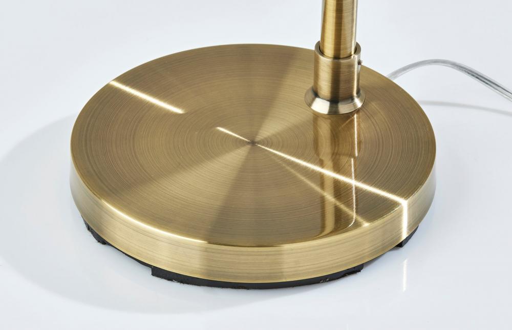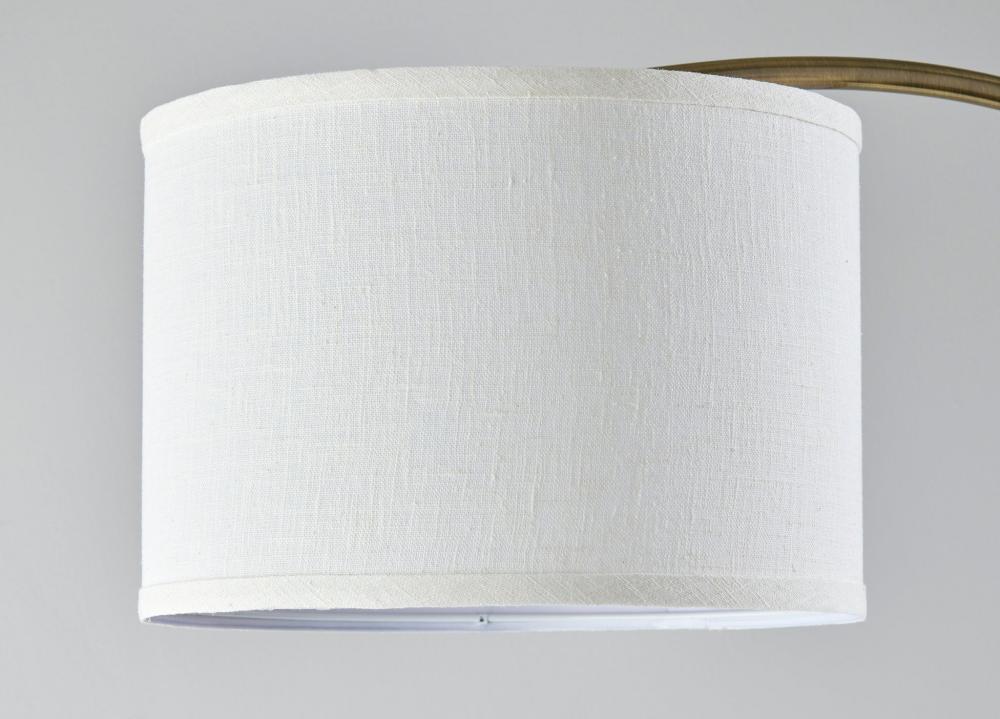 The 64" tall Jace floor lamp by Simplee Adesso stylishly illuminates a seating area with overhead lighting that can be controlled with an adjustable shade. The slightly arcing design of this floor lamp makes it the perfect light source for reading in a recliner or working at a desk, while its slender construction makes it easy to position near couches, armchairs, or side tables. For even greater versatility, the lamp's head features an adjustable joint, allowing you to direct the 100W bulb wherever it's needed. The round antique brass base provides stability, while the clean lines in matching antique brass finish add a mid-century modern, minimalist touch. Topping off the lamp is a short drum shade made of off-white textured fabric. The floor lamp is also available with a black metal finish.