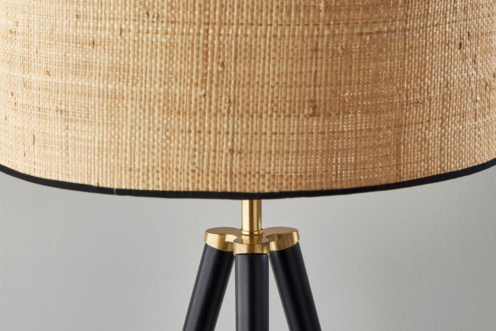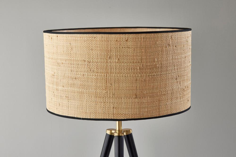 The Jackson floor lamp adds natural elements to the contemporary tripod design for a stunning complement to any decor. The black wood tripod base is sturdy and stylish and features antique brass detailing. Topping the lamp is a short natural rattan drum shade that highlights the texturing of the material as it disperses the light from a 150W bulb. The lamp shade is also trimmed with black fabric along the top and bottom to match the black base. A 3-way rotary socket switch provides a variety of lighting options, allowing you to easily adjust. the brightness between low, medium, and high, while the lamp is powered by a 5' cord covered in black fabric. The Jackson floor lamp is also available with natural wood to complement farmhouse style or a walnut finish for a traditional feel. Complete your decor with the coordinating Jackson table lamp.