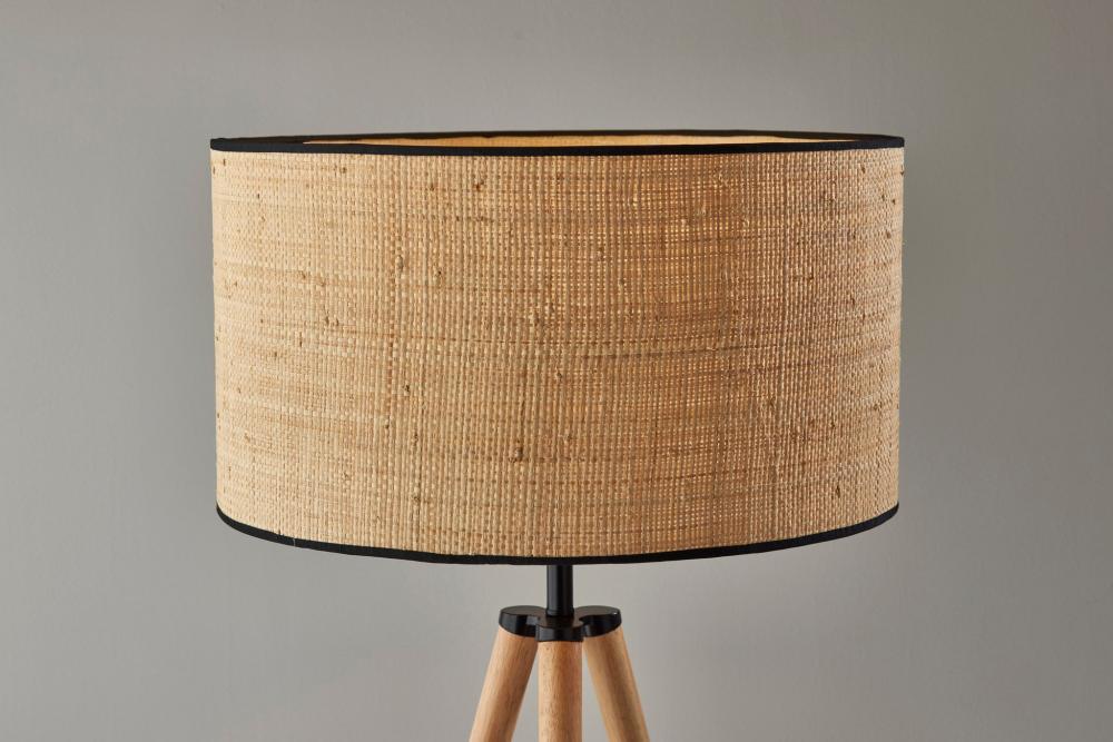 The Jackson floor lamp adds natural elements to the contemporary tripod design for a stunning complement to any decor. The natural wood tripod base is sturdy and stylish and features black metal detailing. Topping the lamp is a short natural rattan drum shade that highlights the texturing of the material as it disperses the light from a 150W bulb. The lamp shade is also trimmed with black fabric along the top and bottom to match the black detailing. A 3-way rotary socket switch provides a variety of lighting options, allowing you to easily adjust the brightness between low, medium, and high, while the lamp is powered by a 5' cord covered in beige fabric. The Jackson floor lamp is also available with black wood to complement contemporary style or a walnut finish for a traditional feel. Complete your decor with the coordinating Jackson table lamp.