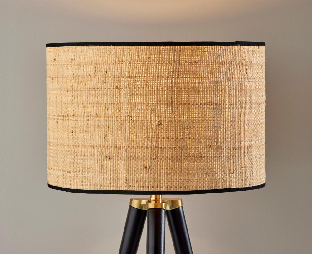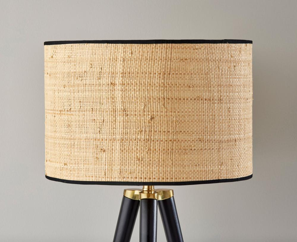 The Jackson table lamp adds natural elements to the contemporary tripod design for a stunning complement to any decor. The black wood tripod base is sturdy and stylish and features antique brass detailing. Topping the lamp is a short natural rattan drum shade that highlights the texturing of the material as it disperses the light from a 100W bulb. The lamp shade is also trimmed with black fabric along the top and bottom to match the black base. A 3-way rotary socket switch provides a variety of lighting options, allowing you to easily adjust the brightness between low, medium, and high, while the lamp is powered by a 5' cord covered in black fabric. The Jackson table lamp is also available with natural wood to complement farmhouse style or a walnut finish for a traditional feel. Complete your decor with the coordinating Jackson floor lamp.